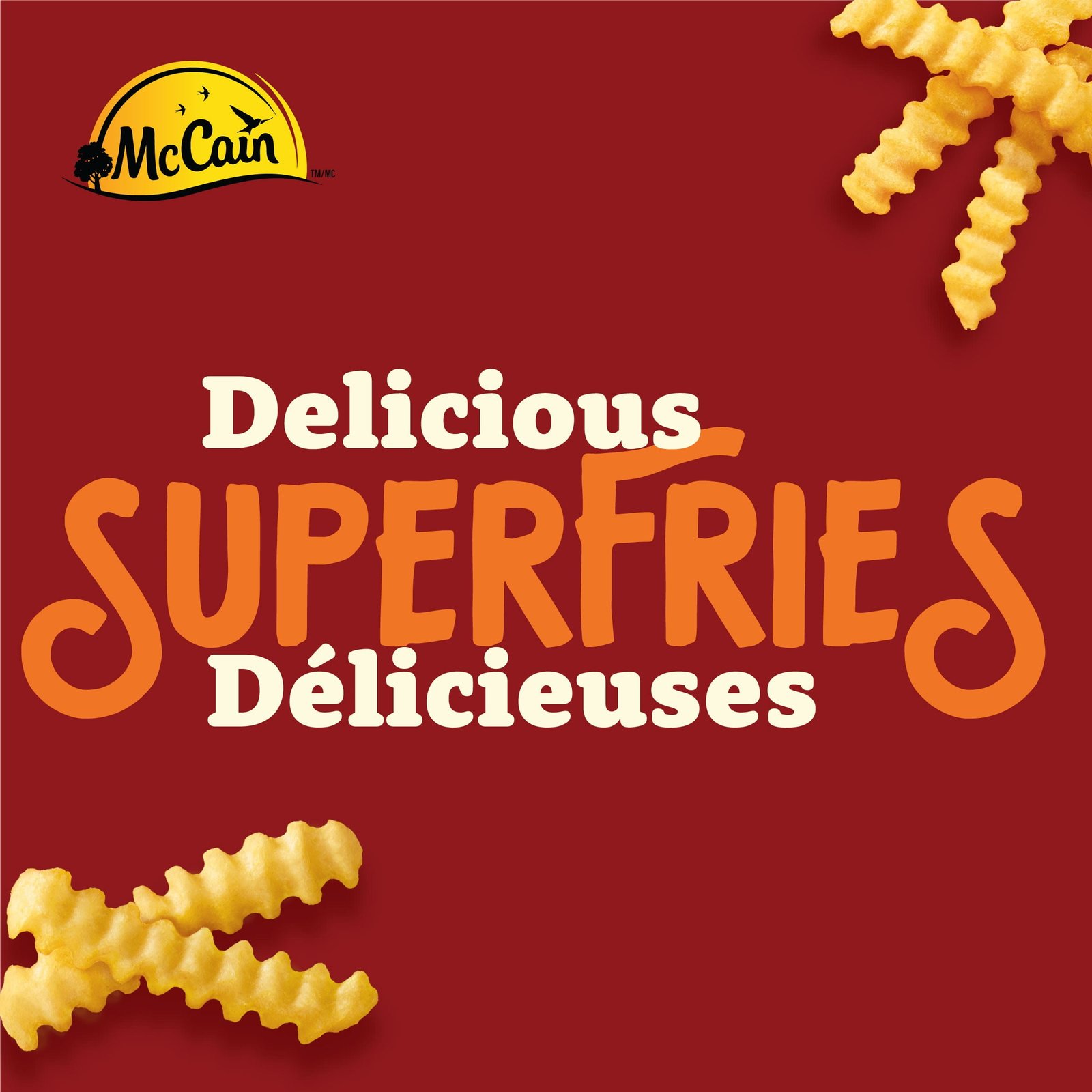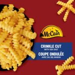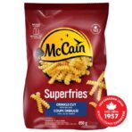 When the time calls for fingers over forks. reach for McCain® Superfries® Crinkle Cut French fries. These delicious frozen French fries are famous for their signature grooves that make them perfect for dipping. Their unique shape provides an amazing texture. and like all McCain fries they bake up deliciously in the oven and equally crispy and crunchy in the air fryer. Whether you’ve got friends over for the game or want to add some excitement to your next family dinner. pop these frozen McCain fries into the oven or air fryer to see why McCain Crinkle Cut French fries are truly a cut above. Made in Canada from domestic and imported ingredients. COOKING INSTRUCTIONS: Air fryer – preheat to 360°F (182°C). fill basket halfway. air fry for 12-13 minutes. sliding out basket and shaking fries halfway through. Oven – preheat to 425°F (218°C) and cook for 18-22 minutes. turning halfway through. See full details on packaging.• Crinkle cut fries