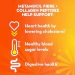 - Premium Collagen Peptides: Metamucil Fibre+ Collagen is made with collagen peptides. a source of essential amino acids involved in the maintenance of good health and involved in protein synthesis