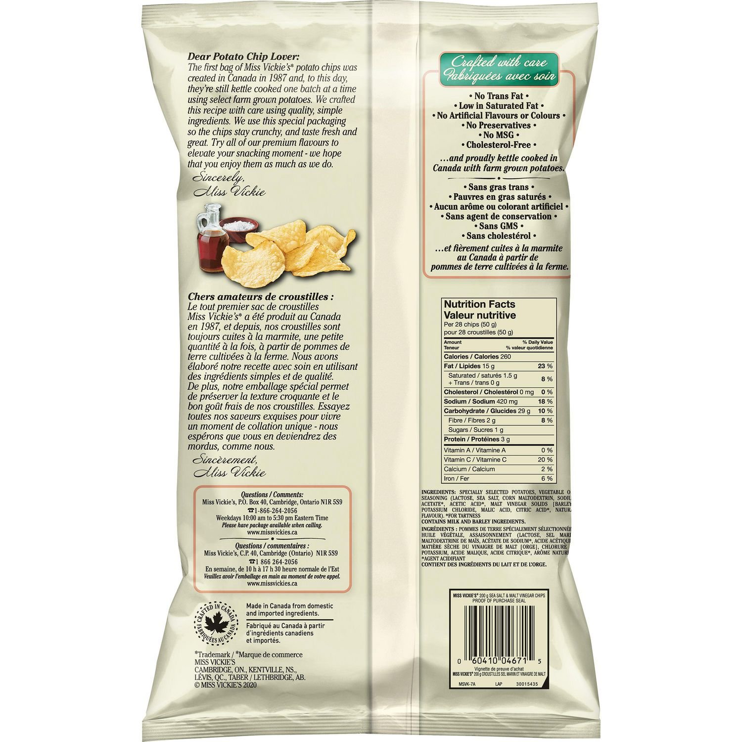 Miss Vickie’s Sea Salt & Malt Vinegar flavour kettle cooked potato chips have no trans fat. are cholesterol-free. and are low in saturated fat per 50 g serving. No artificial flavours or colours. No preservatives. Oh. and no MSG.NO ARTIFICIAL FLAVOURS OR COLOURS – Quality ingredients cooked with care.