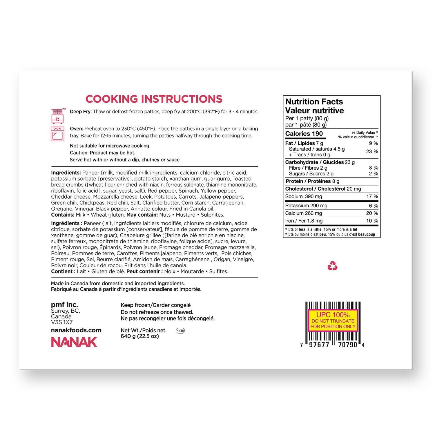 | Ingredients | Paneer (milk. modified milk ingredients. citric acid. calcium chloride. potassium sorbate [preservative]. modified food starch. xanthan gum. guar gum). toasted bread crumbs ([wheat flour enriched with niacin. ferrous sulphate. thiamine mononitrate. riboflavin. folic acid]. sugar. yeast. salt). red pepper. spinach. yellow pepper. cheddar cheese. mozzarella cheese. leek. potatoes. carrots. green chili. chick peas. red chili. salt. clarified butter. corn starch. carrageenan. oregano. vinegar. black pepper. fried in canola oil. |