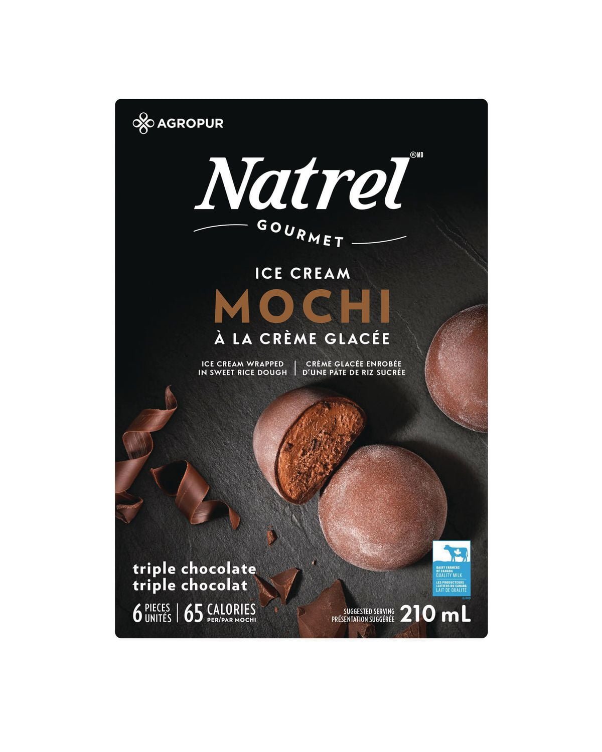 Discover a touch more with Natrel’s new Japanese-inspired indulgent ice cream that can be savoured with your fingers. Let yourself enjoy this refined yet indulgent treat.Taste the new triple chocolate mochi made with chocolate ice cream. chocolate chips and. wrapped in a slightly sweet chocolate rice dough.Only quality Canadian milk—always fresh and wholesome. 100% owned by dairy farmers