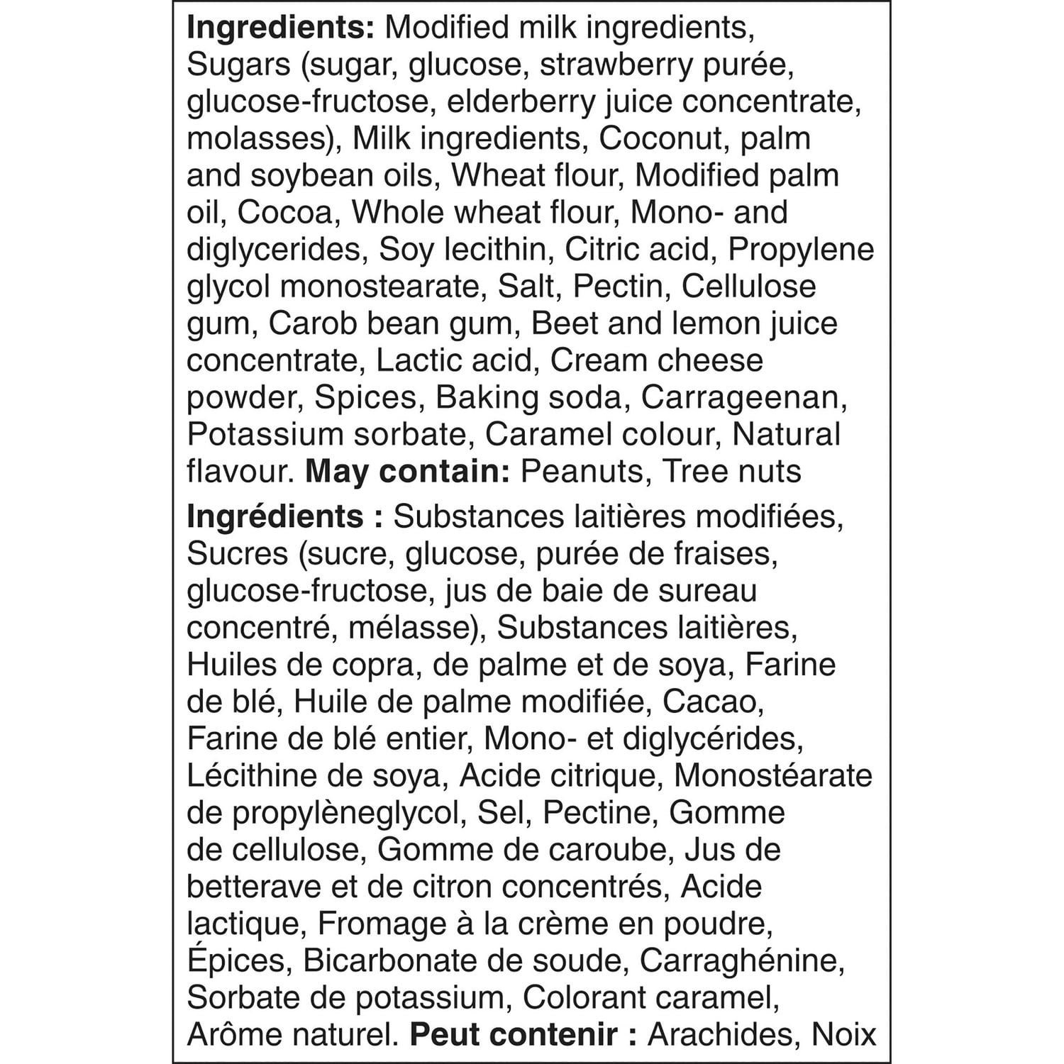 | Ingredients | Modified Milk Ingredients. Sugar. Glucose. Milk Ingredients. Water. Coconut. Palm and Soy Oils. Wheat Flour. Strawberry Purée. Modified Palm Oil. Cocoa. Glucose-Fructose. Whole Wheat Flour. Mono- and Diglycerides. Soy Lecithin. Citric Acid. Propylene Glycol Monostearate. Salt. Beet. Elderberry and Lemon Juice Concentrates. Pectin. Cellulose Gum. Carob Bean Gum. Lactic Acid. Cream Cheese Powder. Sorbic Acid. Spice. Baking Soda. Molasses. Calcium Chloride. Carrageenan. Potassium Sorbate. Colour. Flavour. May contain peanuts and tree nuts. |