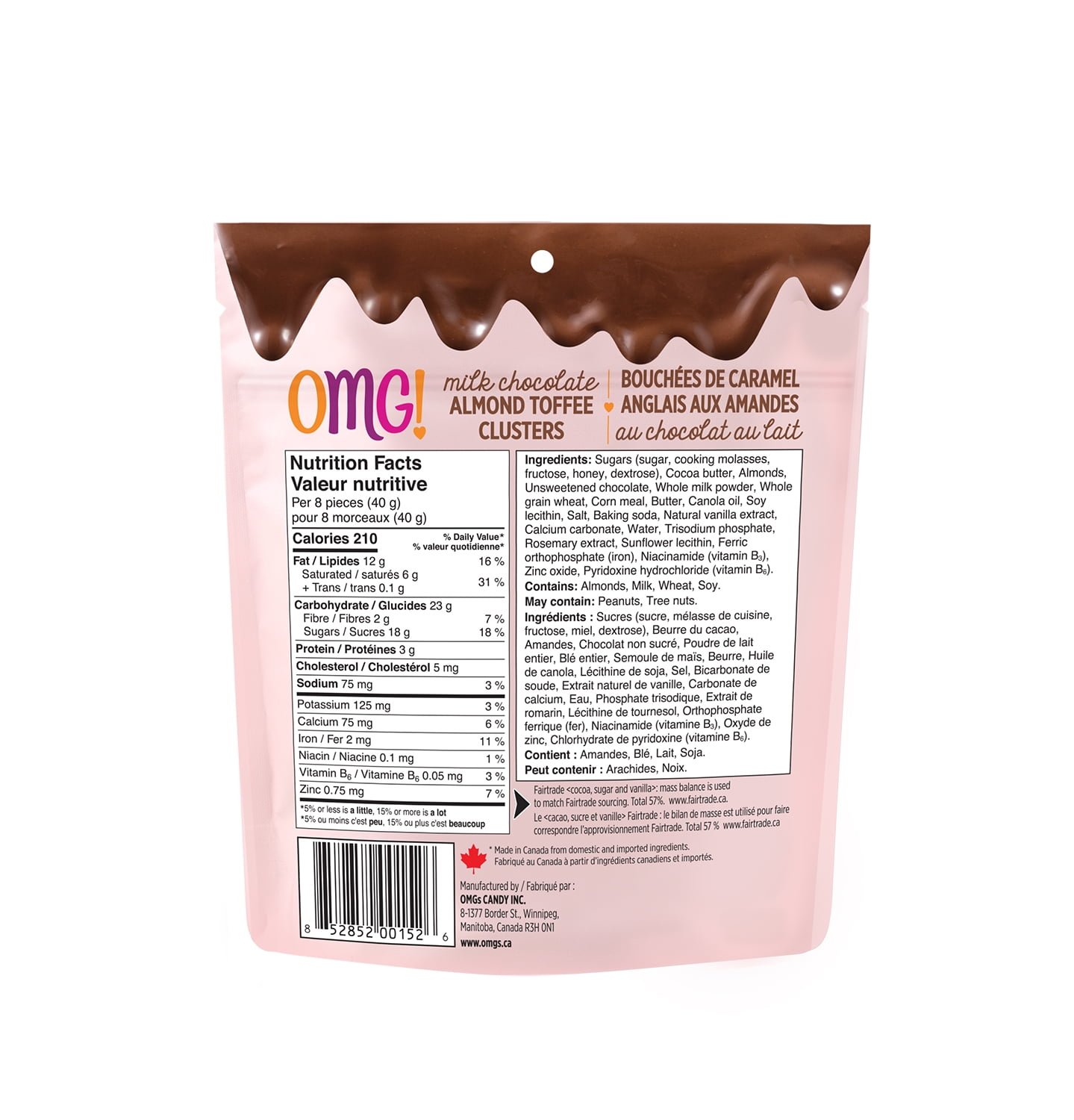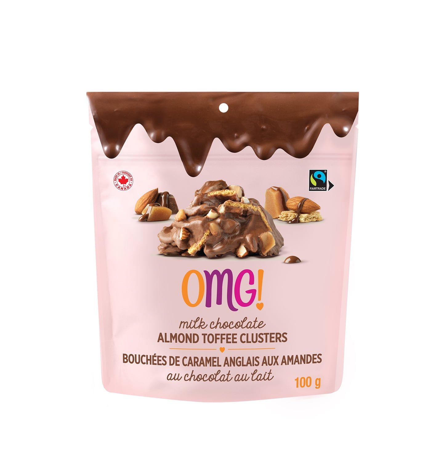 OMG! Milk Chocolate Almond Toffee Clusters. 100 g. Milk Choc. Almonds. Toffee