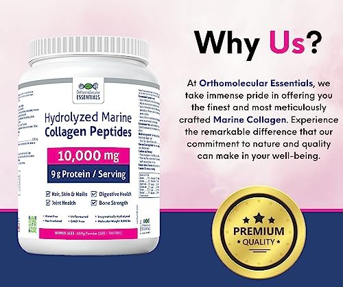 - 🔆 Premium Canadian Quality – Experience the purest form of nourishment for your skin. hair. and nails with Orthomolecular Essentials’ Hydrolyzed Marine Collagen Peptides Powder. proudly crafted in Canada with a potent 10000mg dose for unparalleled support in bone strength and joint health.