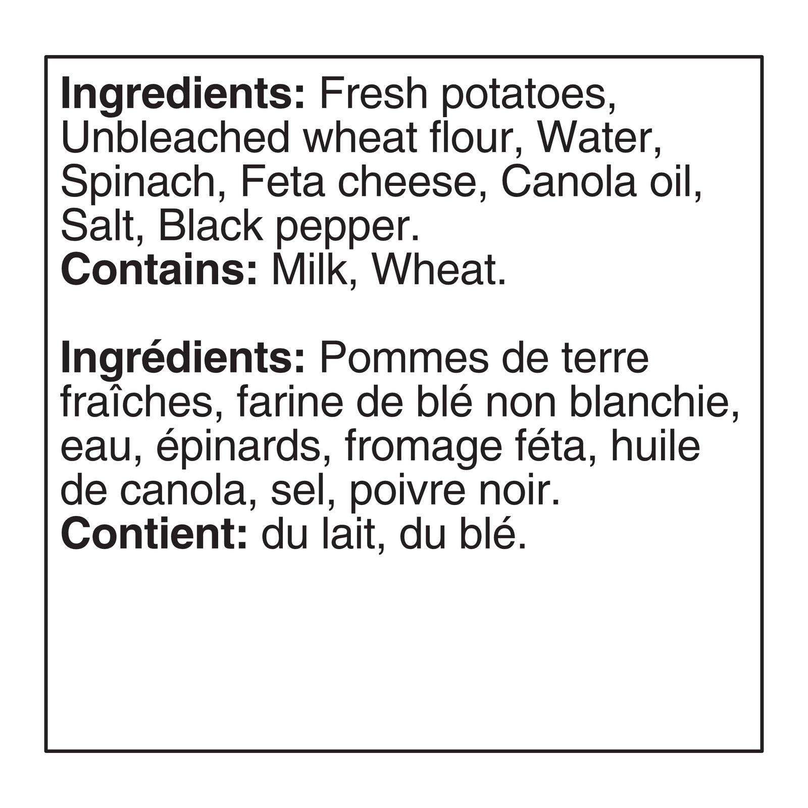 IngredientsFresh potatoes. Unbleached wheat flour. Water. Spinach. Feta cheese. Canola oil. Salt. Black pepper.