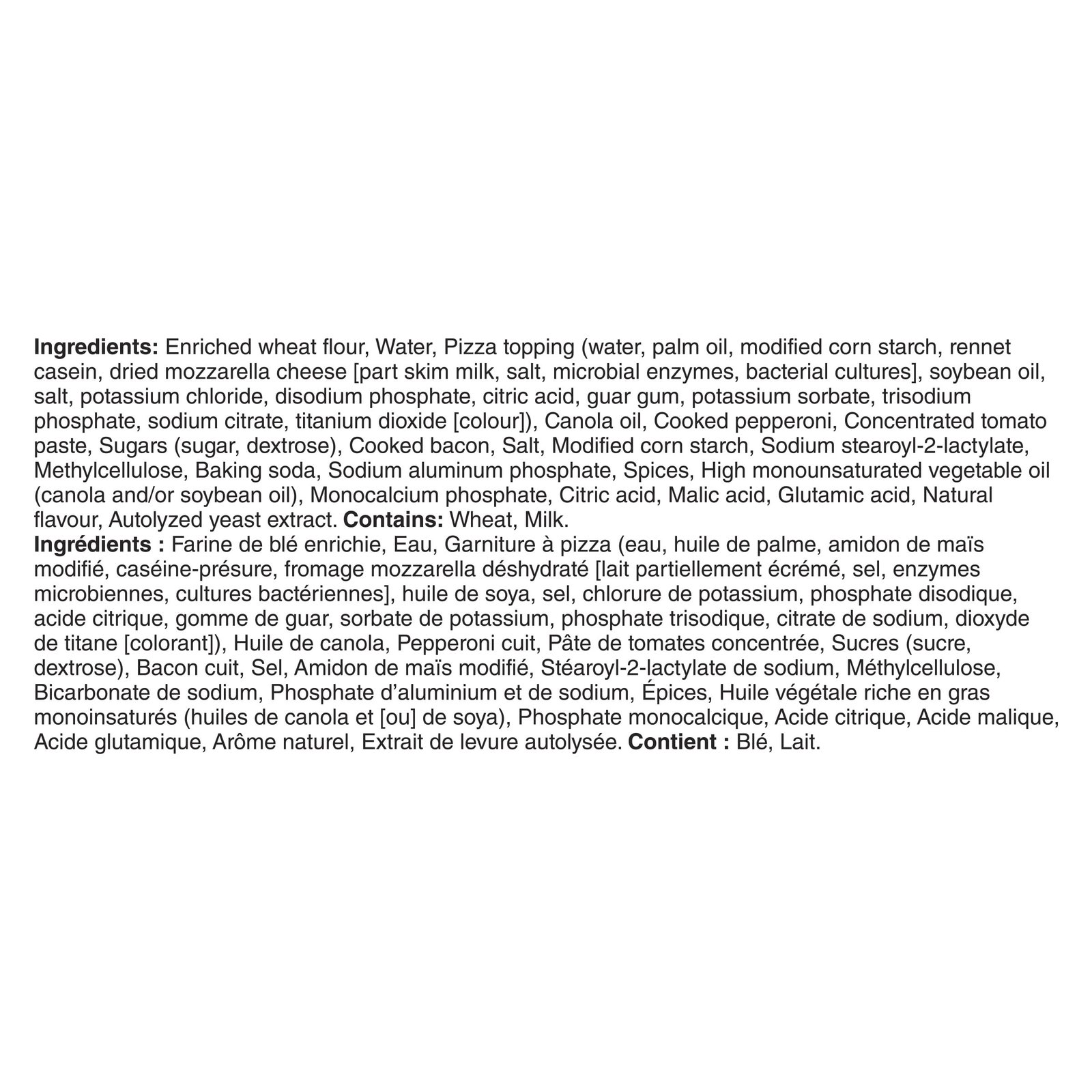 | Ingredients | Enriched wheat flour. Water. Pizza topping (water. palm oil. modified corn starch. rennet casein. dried mozzarella cheese [part skim milk. salt. microbial enzymes. bacterial cultures]. soybean oil. salt. potassium chloride. disodium phosphate. citric acid. guar gum. potassium sorbate. trisodium phosphate. sodium citrate. titanium dioxide [colour]). Canola oil. Cooked pepperoni. Concentrated tomato paste. Sugars (sugar. dextrose). Cooked bacon. Salt. Modified corn starch. Sodium stearoyl-2-lactylate. Methylcellulose. Baking soda. Sodium aluminum phosphate. Spices. High monounsaturated vegetable oil (canola and/or soybean oil). Monocalcium phosphate. Citric acid. Malic acid. Glutamic acid. Natural flavour. Autolyzed yeast extract. Contains: Wheat. Milk. |