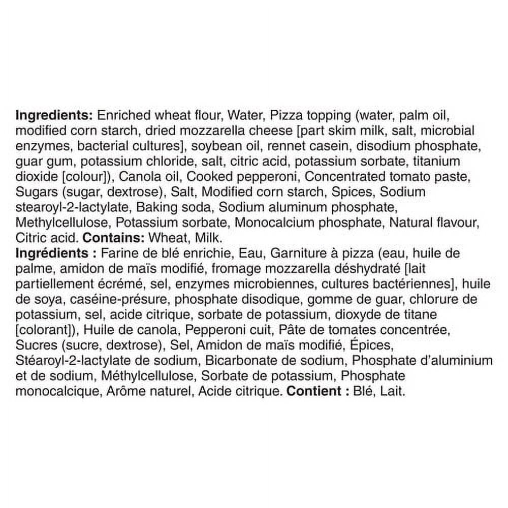 IngredientsEnriched wheat flour. Water. Pizza topping (water. palm oil. modified corn starch. rennet casein. dried mozzarella cheese [part skim milk. salt. microbial enzymes. bacterial cultures]. soybean oil. salt. potassium chloride. disodium phosphate. citric acid. guar gum. potassium sorbate. trisodium phosphate. sodium citrate. titanium dioxide [colour]). Canola oil. Cooked pepperoni. Concentrated tomato paste. Sugars (sugar. dextrose). Salt. Modified corn starch. Spices. Sodium stearoyl-2-lactylate. Baking soda. Sodium aluminum phosphate. Methylcellulose. Potassium sorbate. Monocalcium phosphate. Natural flavour. Citric acid. Contains: Wheat. Milk.