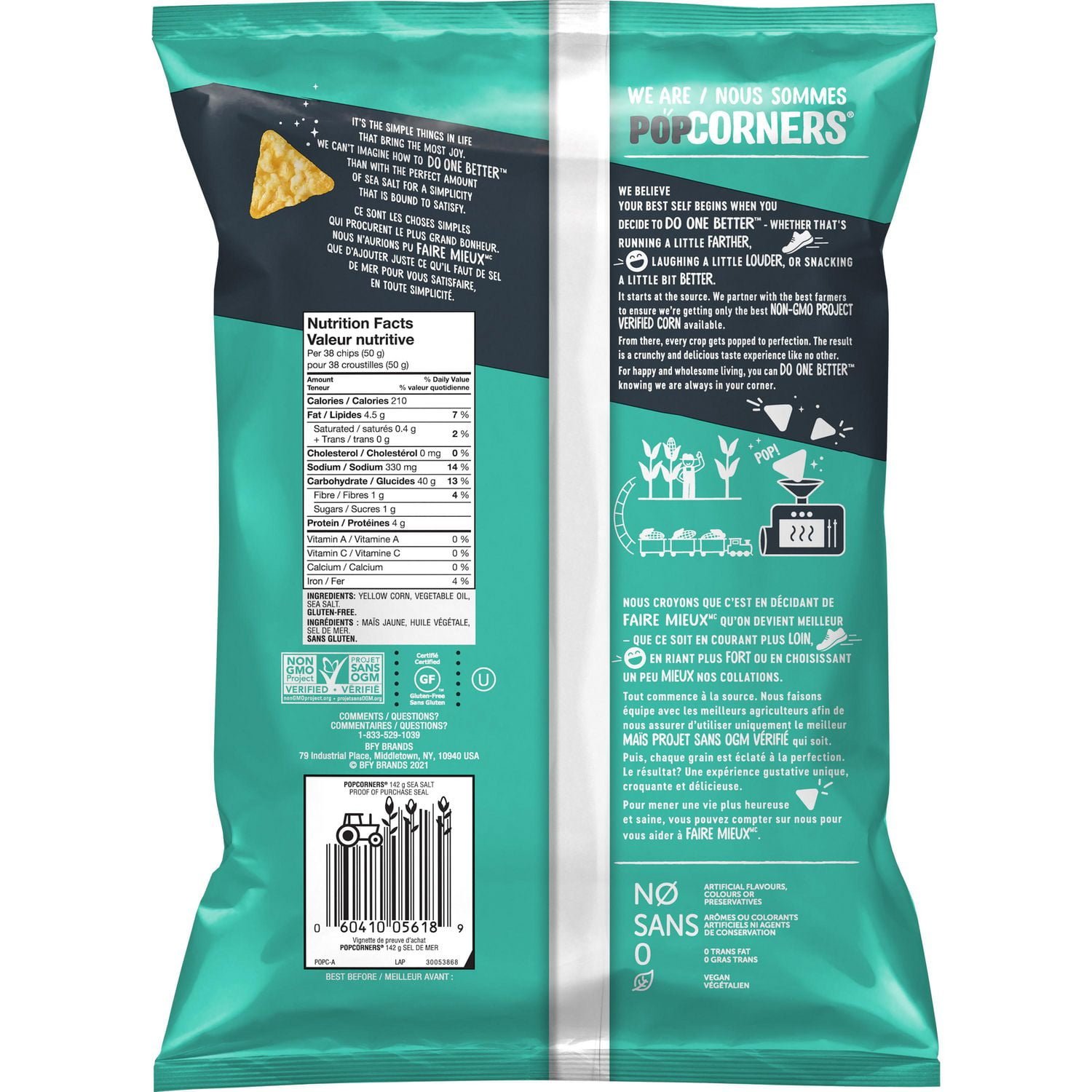 At PopCorners. we always strive to Do One Better — and for us. that starts at the source. We partner with the best farmers to ensure we’re getting only the best corn available.QUALITY INGREDIENTS -Some of our recipes are made with as little as 3 ingredients! GLUTEN-FREE – A tasty option for celiac-friendly diets. 0 TRANS FAT – Never fried. always air popped to create a snack that puts a smile on your face. FARMER PARTNERS – We partner with the best farmers to ensure we’re getting only the best corn available.