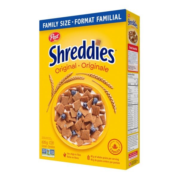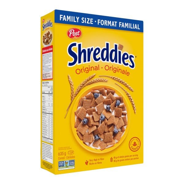 Post Shreddies Original Breakfast Cereal. Made with Whole Grains. Very High in Fibre. Non-GMO Project Verified. Family Size 635g