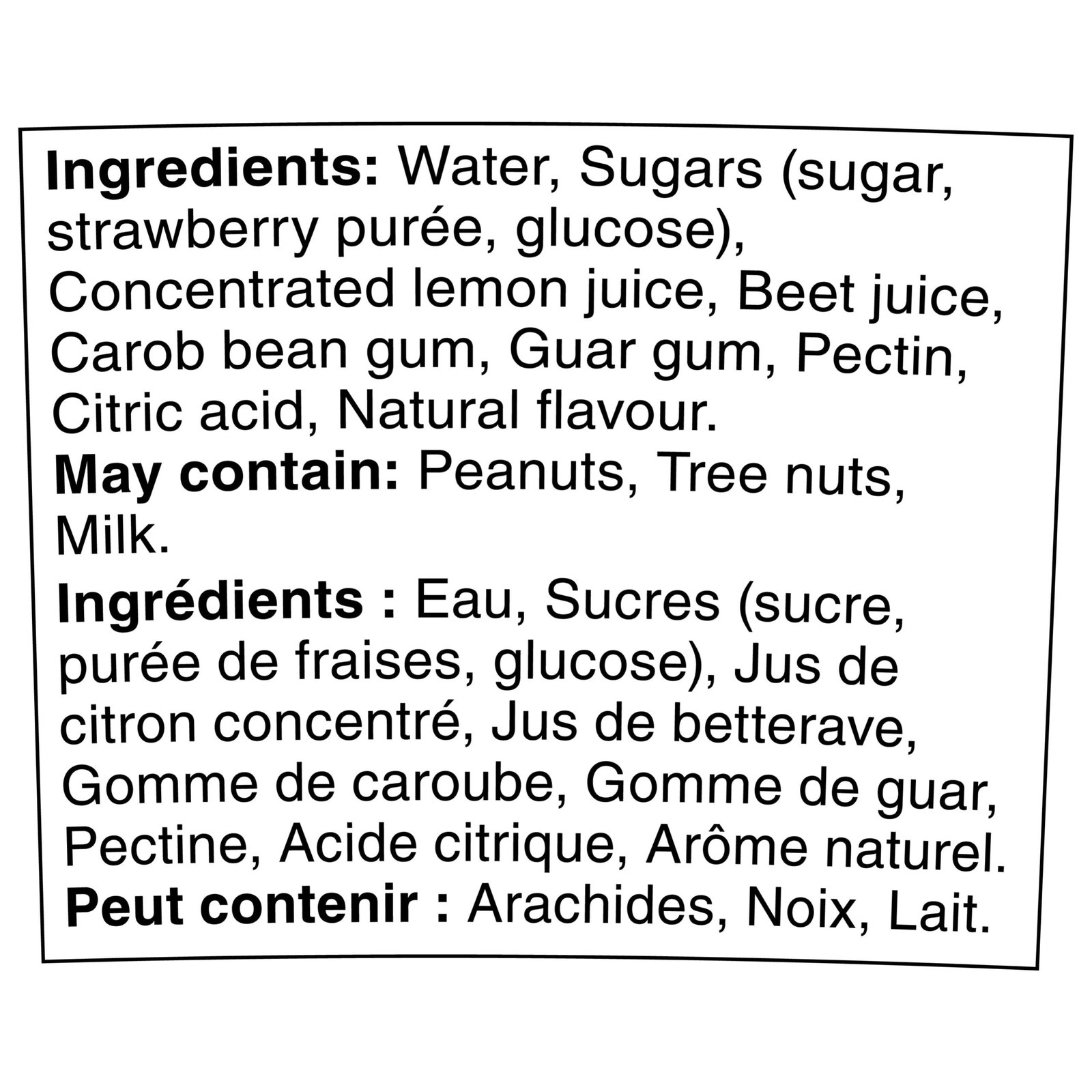 | Ingredients | Ingredients: Water. Sugars (sugar. strawberry purée. glucose). Concentrated lemon juice. Beet juice. Carob bean gum. Guar gum. Pectin. Citric acid. Natural flavour. |