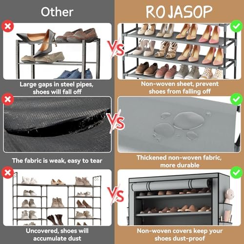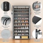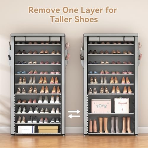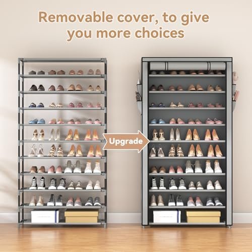 ROJASOP 10 Tier Shoe Rack with Cover. Large Capacity Stackable Tall Shoe Shelf Storage to 50-55 Pairs Shoes and Boots Sturdy Vertical Shoe Rack Organizer for Closet. Entryway. Garage. Grey
