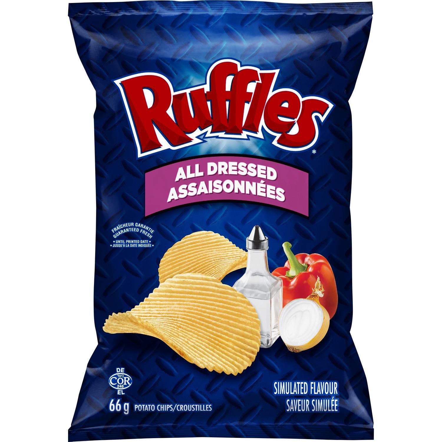 Ruffles is Canada’s favourite ridged potato chip brand. delivering big. satisfying crunch and mouth-watering taste with every bag! Whether you’re kicking back with family. watching the game. or just treating yourself to something truly delicious. Ruffles potato chips always hit the spot. And here in Canada. we know the snack table wouldn’t be complete without a signature bag of Ruffles All Dressed flavoured potato chips!DESIGNED FOR DIPPING — Whether you’re digging into a hot cheesy mix. sour cream or a jar of Ruffes Onion flavoured dip. the crunch of Ruffles potato chips make them the perfect chips to serve alongside all of your favourite dips.