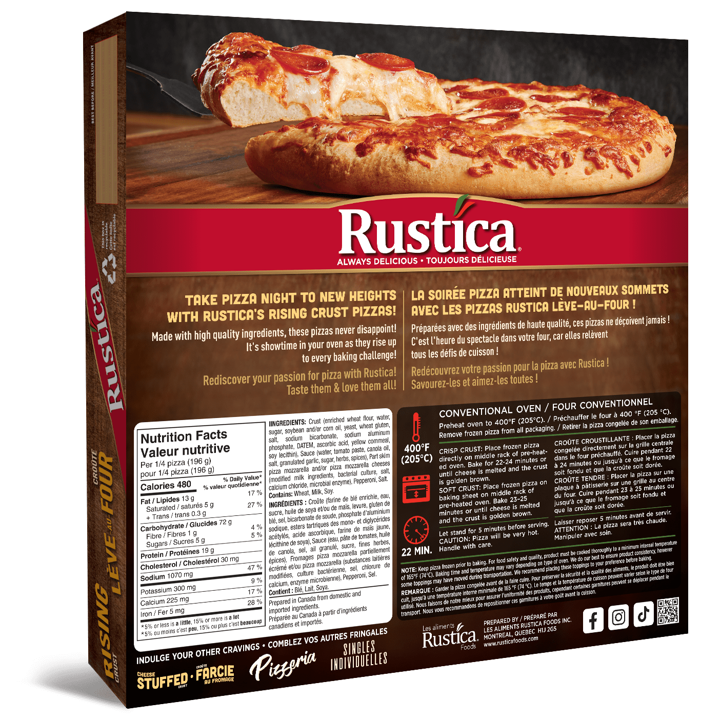 Take pizza night to new heights with Rustica’s Rising Crust Pizzas! Made with high quality ingredients. these pizzas never disappoint. It’s show time in your oven as they rise up to every baking challenge! Rediscover your passion for pizza with Rustica. Our Pepperoni Rising Crust Pizzas are topped with a savoury pizza sauce. real mozzerella cheese and tasty pieces of pepperoni. Taste them and love them all!