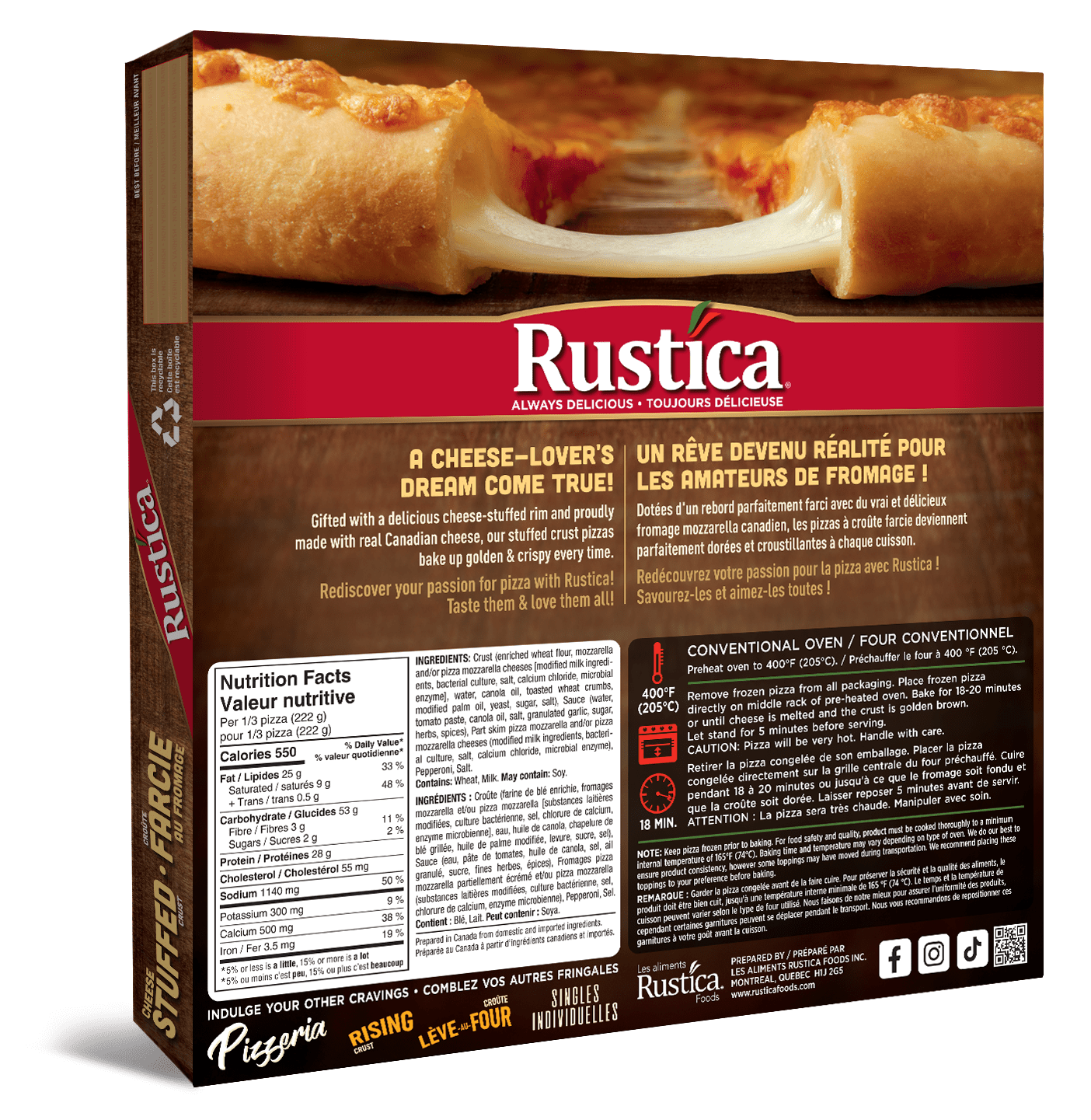 A cheese-lover’s dream come true! Gifted with a delicious cheese-stuffed rim and proudly made with real Canadian cheese. our Stuffed Crust Pizzas bake up golden & crispy every time. Rediscover your passion for pizza with Rustica. Our Pepperoni Stuffed Crust Pizzas are topped with a savoury pizza sauce. real mozzerella cheese. delicious pepperoni. Taste them and love them all!