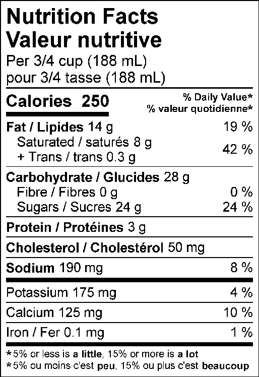 | Ingredients | Milk. cream. sugar. glucose. skim milk powder. modified milk ingredients. stabilizer (mono and diglycerides. locust bean gum. cellulose gum. guar gum. carrageenan. dextrose). artificial flavour. |