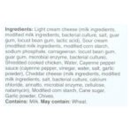 | Ingredients | Light cream cheese (milk ingredients; modified milk ingredients; bacterial culture; salt; guar gum; locust bean gum; lactic acid); Sour cream (modified milk ingredients; modified corn starch; sodium phosphate; carrageenan; locust bean gum; guar gum; microbial enzyme; bacterial culture); Shredded cooked chicken; Water; Cayenne pepper sauce (cayenne pepper; vinegar; water; salt; garlic powder); Cheddar cheese (milk ingredients; modified milk ingredients; salt; bacterial culture; calcium chloride; annatto; microbial enzyme; cellulose; natamycin); Modified corn starch; Cane sugar; Garlic powder; Chives. Contains: Milk. May Contain: Wheat. |