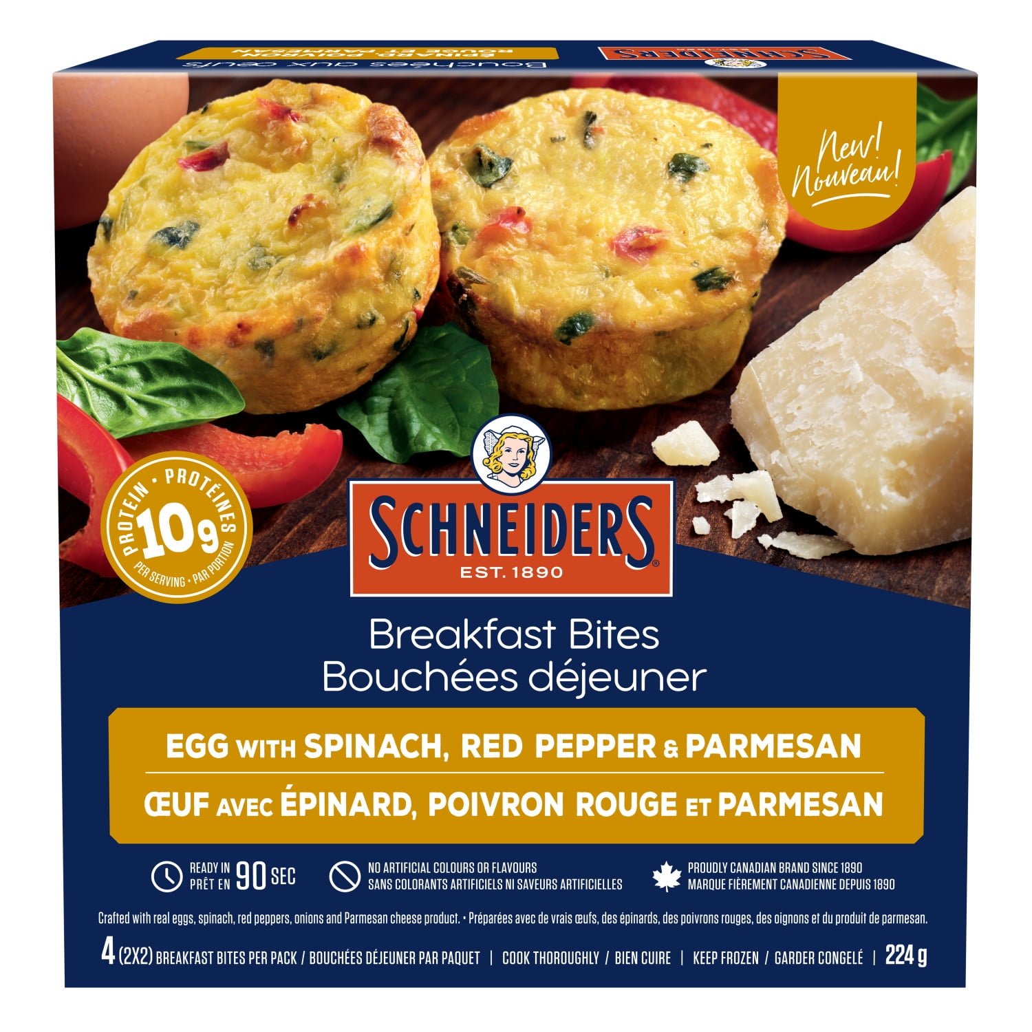 | Ingredients | Liquid whole egg; Milk; Onions; Parmesan cheese product (modified milk ingredients; milk; bacterial culture; salt; calcium chloride; microbial enzyme; flavour; cellulose); Modified corn starch; Spinach; Red peppers; Skim milk powder; Canola oil; Salt; Garlic powder; Spice. Contains: Eggs; Milk. May contain: Wheat. |