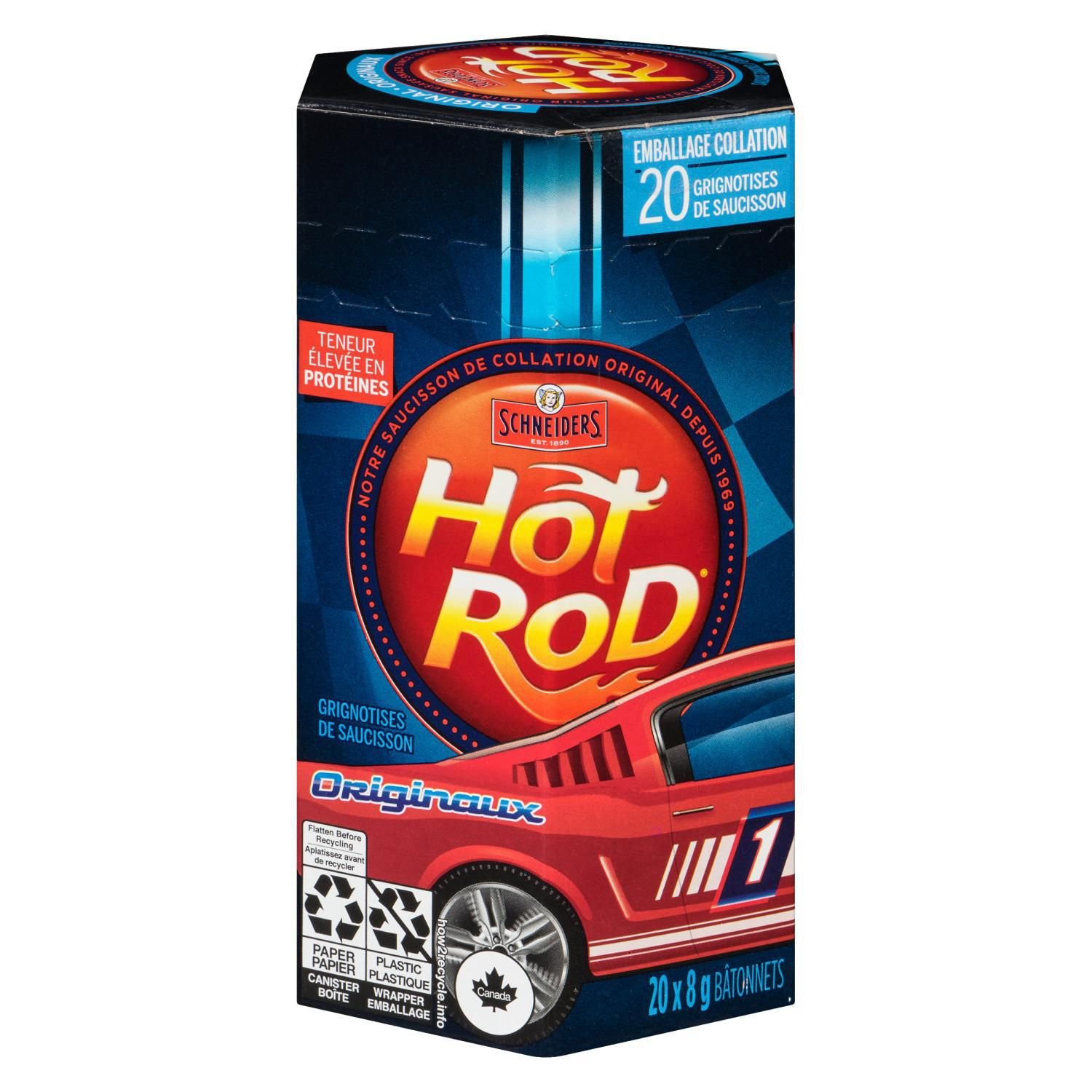 Experience savoury meat flavour in a handy. portable snack with Schneiders® Hot Rod® Sausage Snacks. These sweet-and-salty dried meat sticks are fermented and dried for the ideal amount of time to create a delightful jerky-like texture. Premium cuts of beef and chicken perfectly seasoned with a blend of spices make these sausage snacks a delicious treat. Requiring no refrigeration. Schneiders® Hot Rod® sausage sticks are a satisfying snack during outdoor activities such as hiking. or while at home or at work. Since 1890. Schneiders® has made high-quality cured meat with authentic. family recipes. and still uses the same techniques and recipes today. Quality never gets old.