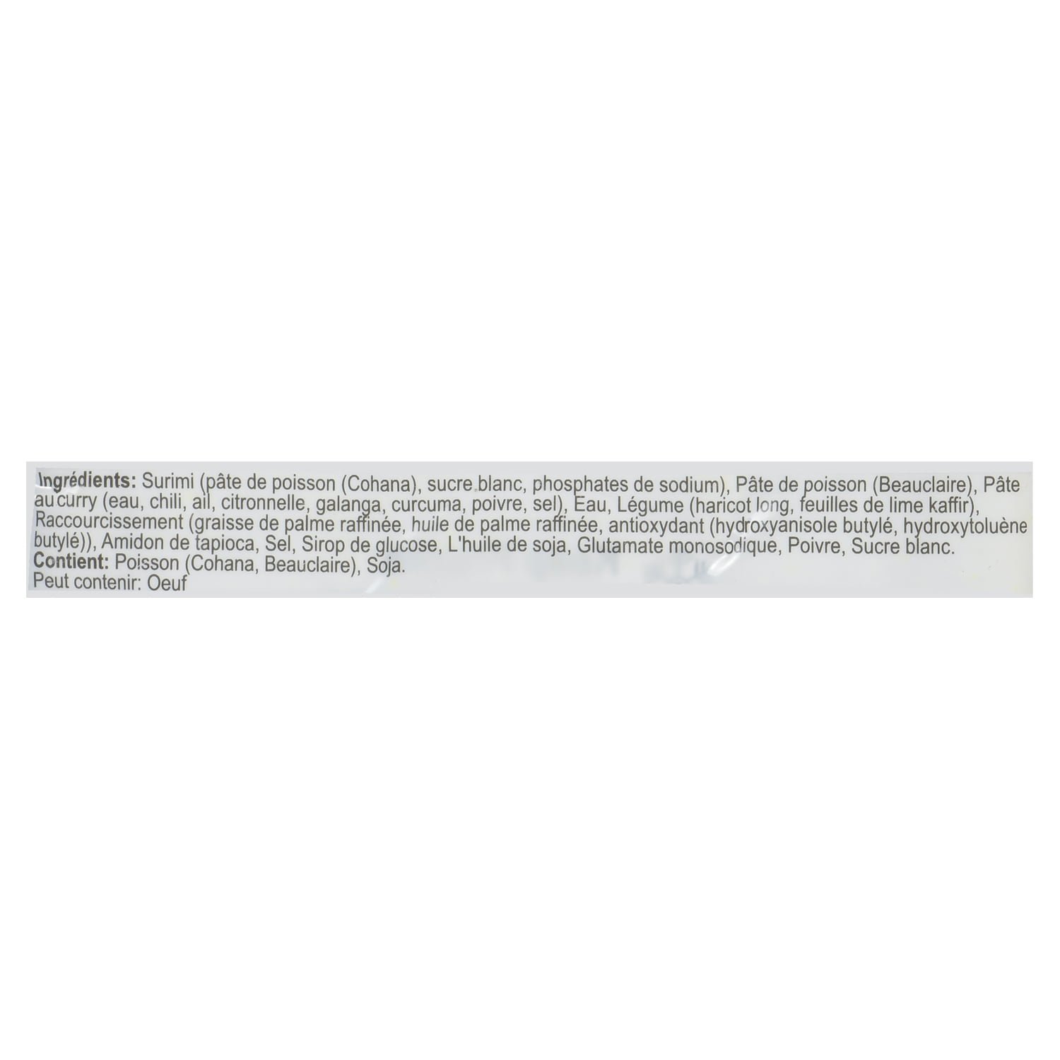 | Ingredients | Surimi (fish paste (threadfin bream). white sugar. sodium phosphates). fish paste (bigeye). curry paste (water chili. garlic. lemongrass. galangal. turmeric. pepper. salt). water. vegetable (long bean. kaffir lime leaves). shortening (refined palm fat. refined palm oil. antioxidant (butylated hydroxyanisole. butylated hydroxytoluene)). tapioca starch. salt. glucose syrup. soybean oil. monosodium glutamate. pepper. white sugar. CONTAINS: fish (threadfin bream. bigeye). soy. May contains: egg |