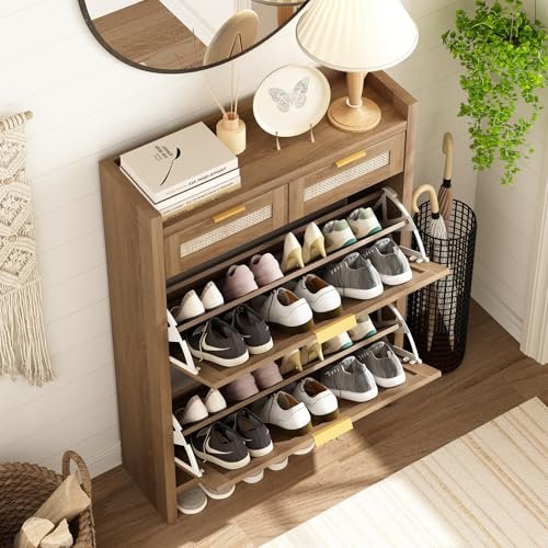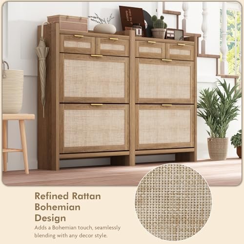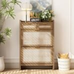 Shoe Organizer Cabinet Storage for Entryway – Slim Rattan Shoe Rack for Front Door Entrance. Narrow Hidden Shoe Cabinet with Flip Drawers. Boho Shoe Holder Cabinet .Two Doors. Oak