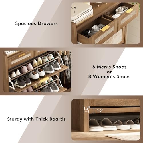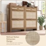 • Bohemian Sophistication – This slim shoe cabinet captures the spirit of bohemian design with its natural rattan doors and warm wood-grain finish. evoking the timeless beauty of solid wood. Accented with elegant golden handles. its design exudes understated luxury. Behind its sleek flip doors lies a discreet shoe storage solution. seamlessly combining practicality with artistic charm.