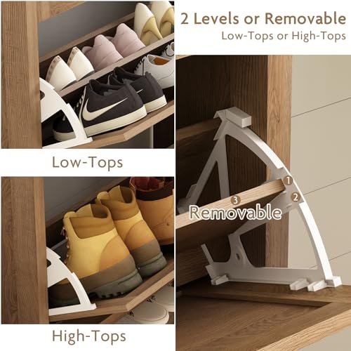 • For Low-Tops or High-Tops – This shoe cabinet features two spacious flip drawers. each with dual-tiered compartments. allowing it to hold up to 16 pairs of shoes. The adjustable panels can be removed to accommodate taller footwear like mid boots or heels. ensuring versatility for various needs. The open bottom offers additional room for slippers or a sweeping robot. keeping your home tidy and functional.