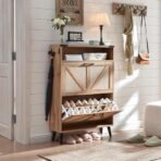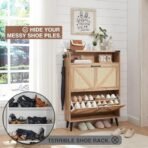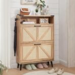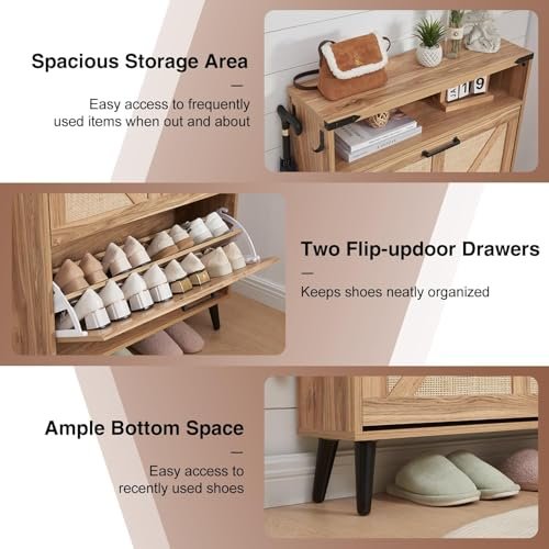 Shoe Storage Cabinet. Boho Rattan Shoe Organizer with 2 Flip Drawers.Farmhouse Freestanding Hidden Slim Narrow Shoe Rack Cabinet with Open Shelves for Entryway. Foyer.Hallway. Natural