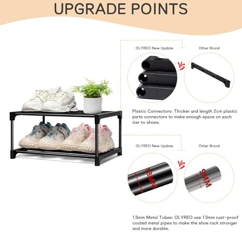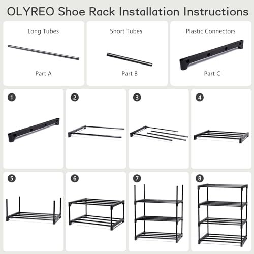 • Details We Care: Different with other shoe racks. OLYREO upgraded the metal tubes and plastic connect of the shoe rack. OLYREO use 13mm rust-proof coated metal pipes and quality thicker plastic parts connectors to make the small shoe rack stronger and more durable