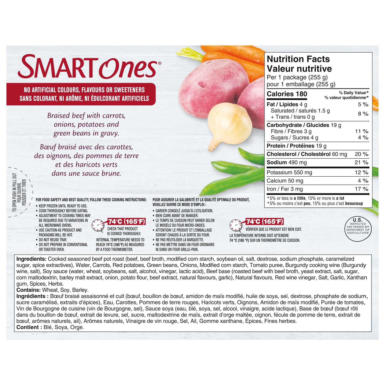 Smart Ones Homestyle Beef Pot Roast delivers delicious American style flavors to satisfy your cravings in an easy to make microwave meal that’s ready in minutes. This frozen dinner features homestyle pot roast and potatoes with carrots. onions. green beans and gravy. As an added bonus. this tasty and easy American inspired pot roast dinner has 18 grams of protein per serving. Each Smart Ones Homestyle Beef Pot Roast frozen entree comes packaged in a microwaveable tray for easy meal preparation.• One 255g box of Smart Ones Homestyle Beef Pot Roast• Only 180 calories per box• Homestyle roast beef with potatoes and carrots. onions. green beans and gravy• Each microwave dinner has 18 grams of protein per serving• Includes a microwave tray for easy meal preparation
