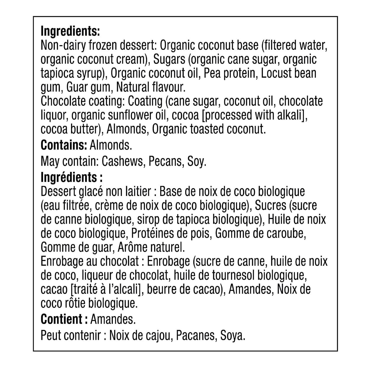 | Ingredients | Non-dairy frozen dessert: Organic coconut base (filtered water. organic coconut cream). Sugars (organic cane sugar. organic tapioca syrup). Organic coconut oil. Pea protein. Locust bean gum. Guar gum. Natural flavor. Chocolate coating: Coating (cane sugar. coconut oil. chocolate liquor. organic sunflower oil. cocoa [processed with alkali]. cocoa butter). Almonds. Organic roasted coconut. Contains: Almonds. May contain: Cashews. Pecans. Soy. |