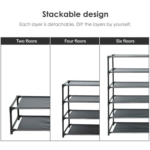 • SPACE SAVING SHOE ORGANIZER: With amazing size of 34 W x 11 7/16 D x 41 5/16 H. and 6 11/16 Layers Height. this shoe rack is suitable for men. women and kids’ shoes.