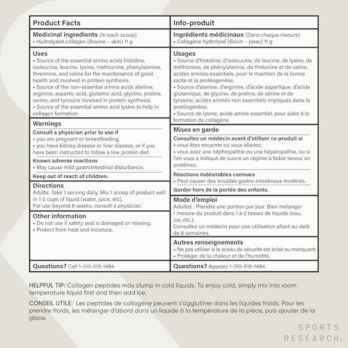 - EASY TO USE: Meet your new morning ritual! Dissolving conveniently and easily in hot or cold water. Sports Research Collagen Peptides tastes great and dissolves completely in coffee. tea. smoothies. soups. and more. Our hydrolyzed formula is an easy way to supplement collagen type 1 and collagen type 3 into your daily ritual. Collagen peptides powder for women and men provides support for healthy joints. bones. skin & nails.