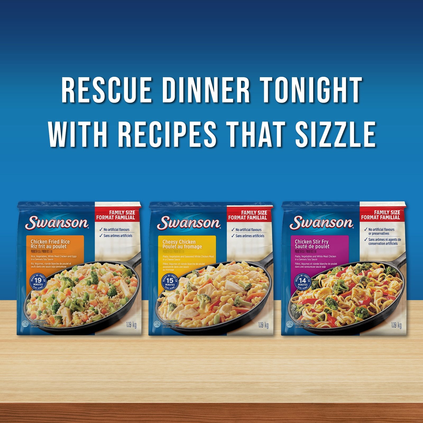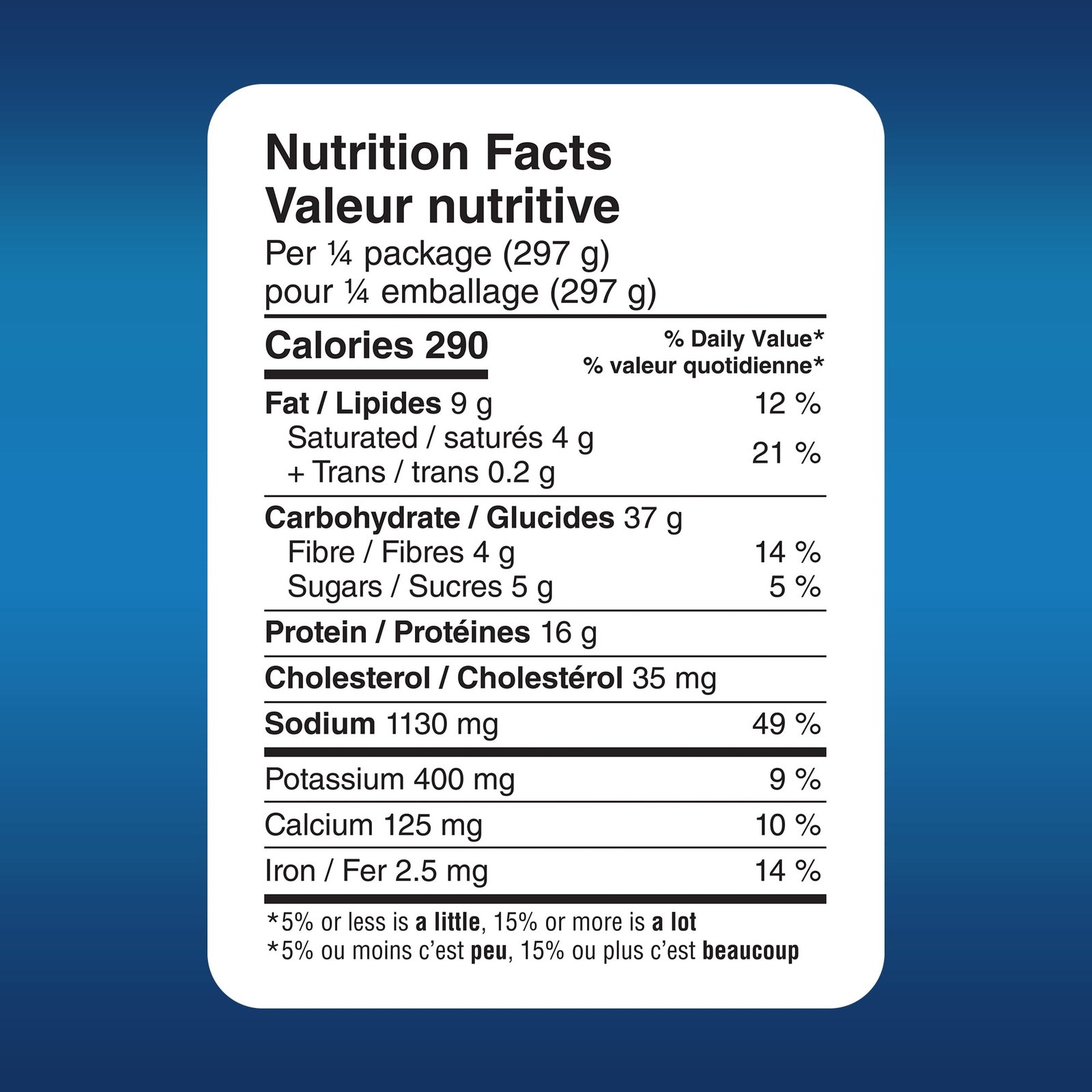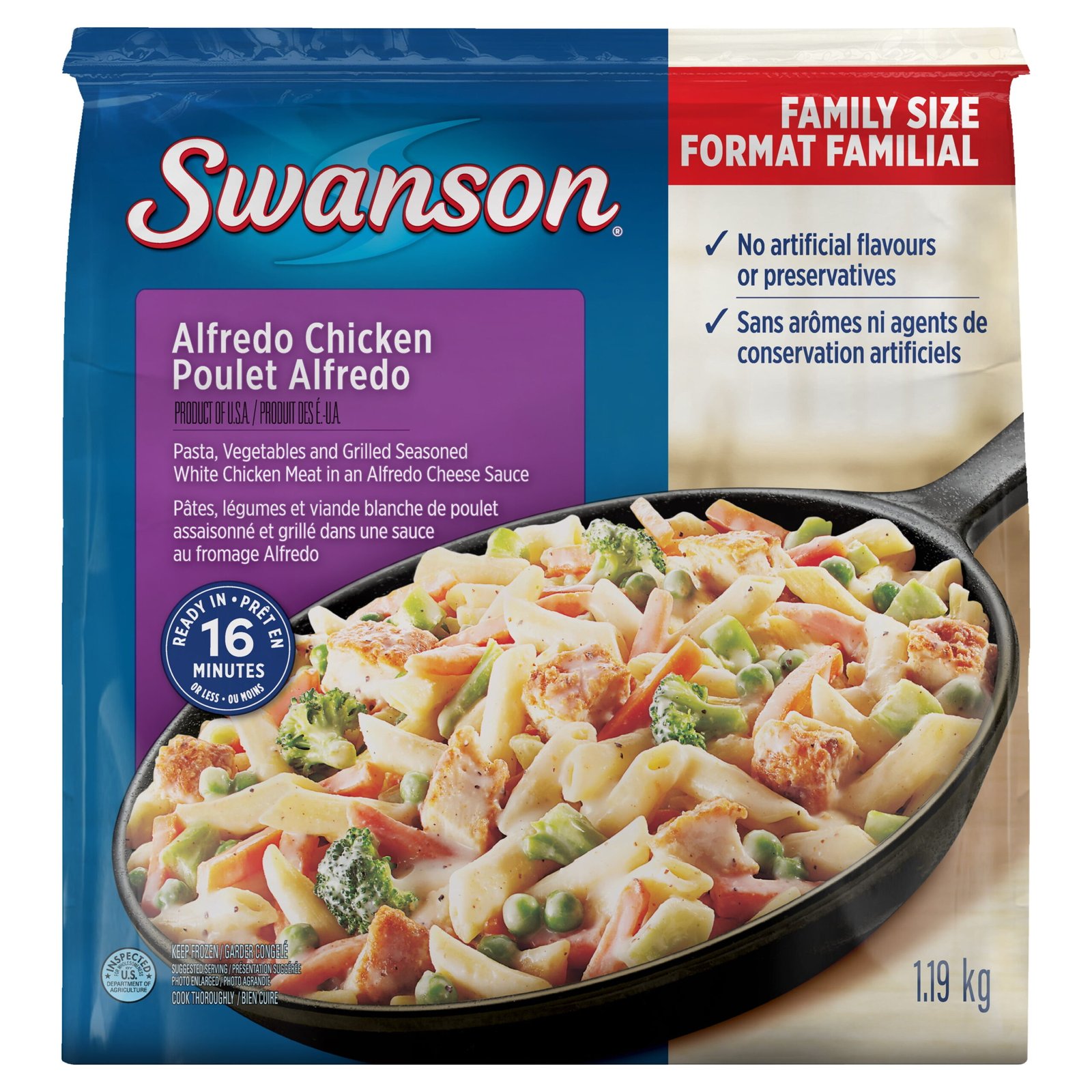 | Ingredients | Alfredo sauce : water. cream blend (cream. skim milk. skim milk powder). grated parmesan cheese product (parmesan cheese. cornstarch. cellulose gel). flavoured butter (butter. flavour). parmesan cheese seasoning. salt. skim milk. garlic powder. modified cornstarch. seasoning. hydrolyzed corn gluten. spices. xanthan gum. Cooked enriched pasta: water. pasta. Seasoned diced coated cooked chicken: chicken. water. isolated soy protein. seasoning. salt. sodium phosphate. natural flavour. Coating: corn flour. enriched flour. salt. cornstarch. soybean oil. maltodextrin. garlic powder. caramel colour. spices. Carrots. Broccoli. Peas |