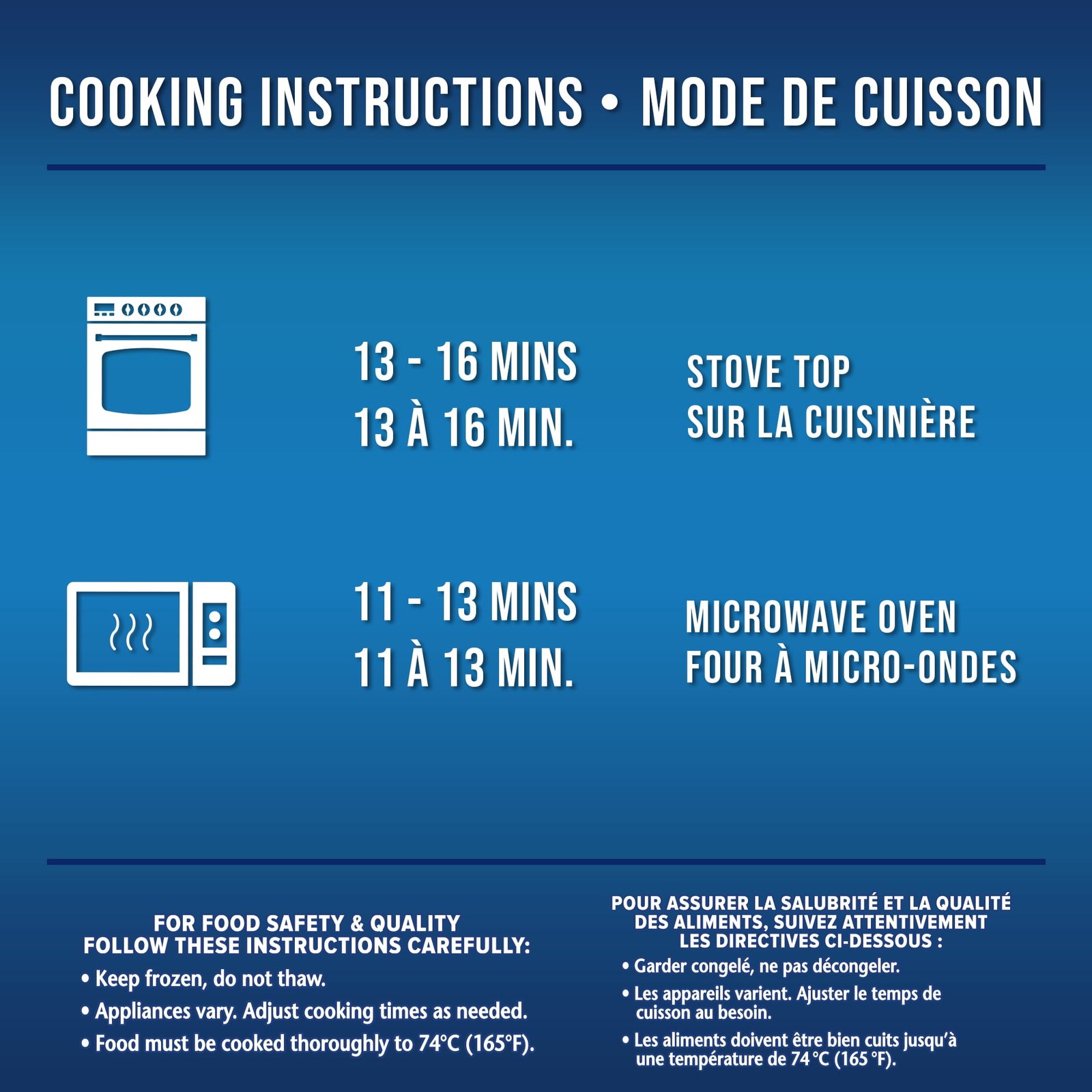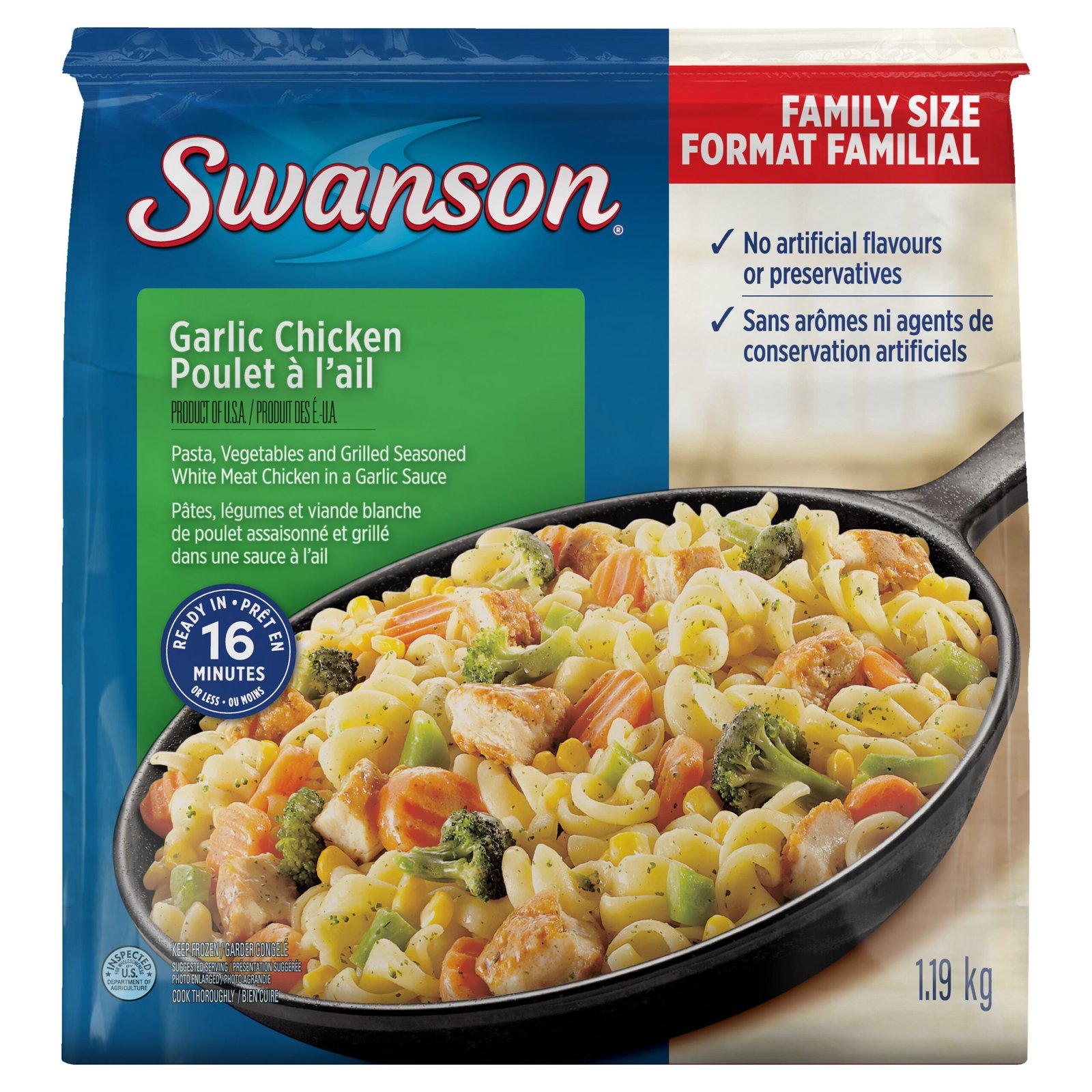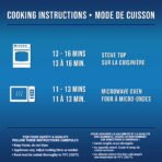 | Ingredients | Pasta with garlic sauce: (enriched durum wheat semolina. water. soybean oil. whey solids. salt. garlic seasoning [garlic powder. sugar. spices. yeast extract. salt. whey. modified milk fat. natural flavours. silicon dioxide]. enriched wheat flour. cream flavour. garlic oil blend [modified coconut oil and or palm kernel oil. natural flavours. .soy lecithin. rosemary oil]). Broccoli. Carrots. Corn. Seasoned chicken breast: (chicken. water. isolated soy protein. seasoning [sugar. garlic. Romano cheese. dehydrated onion]. salt. sodium phosphates. natural flavour. Coating: (corn flour. enriched flour. salt. cornstarch. spices. maltodextrin. garlic powder. soybean oil. caramel colour. calcium silicate) |