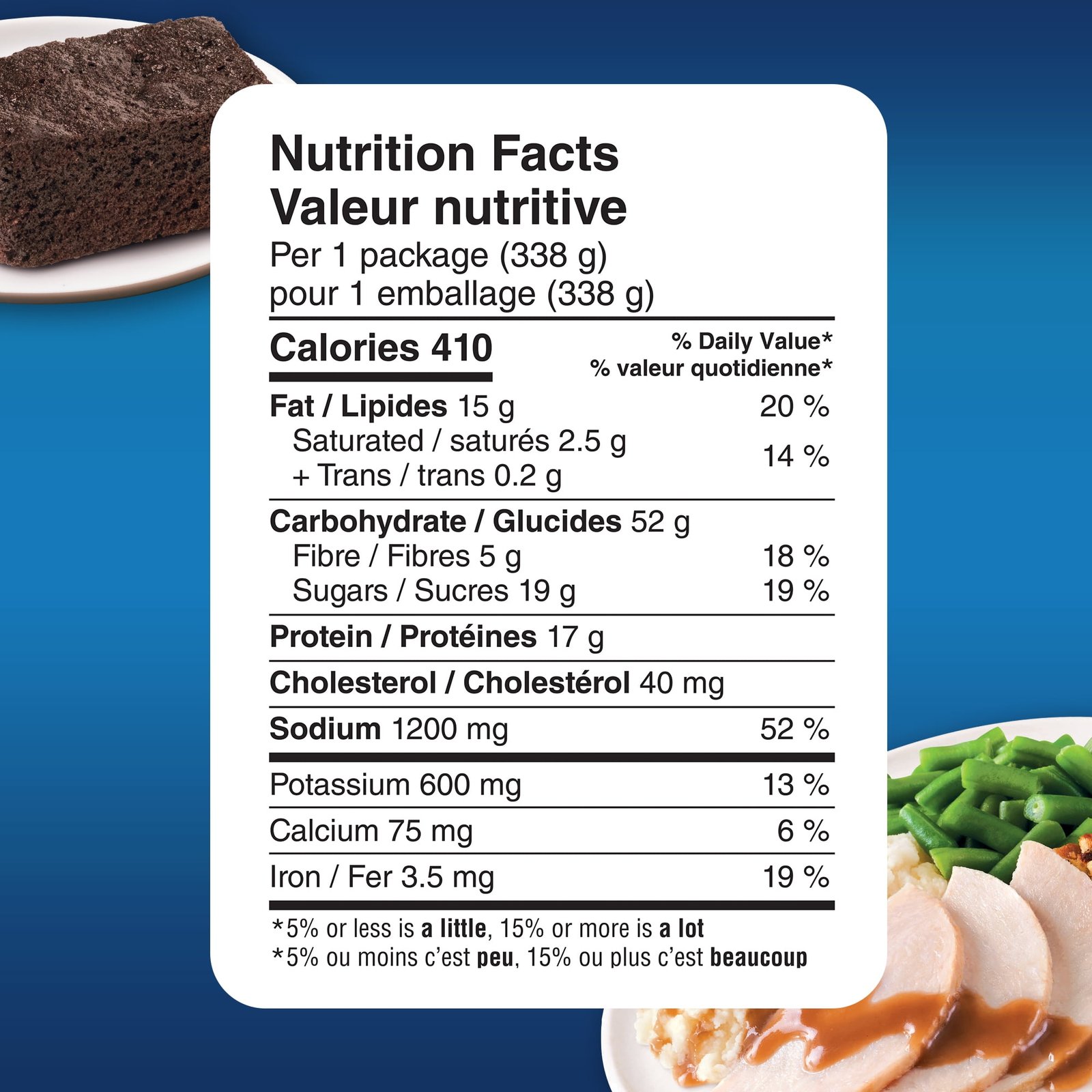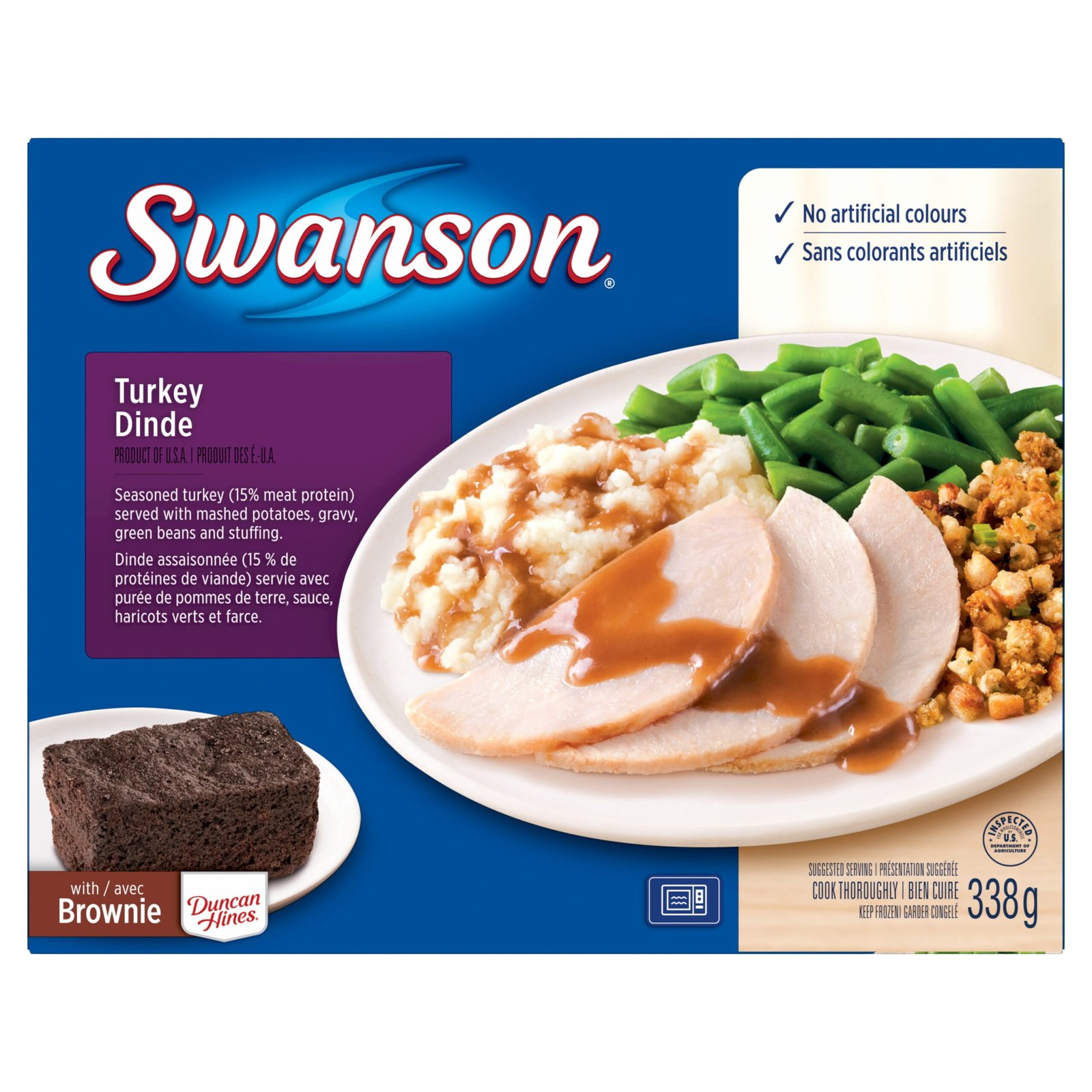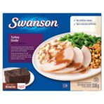 Savour Swanson Turkey frozen meal as a satisfying lunch or flavourful dinnertime meal. Enjoy mouthwatering seasoned turkey (15% meat protein) served with mashed potatoes. gravy. green beans. stuffing. and a brownie for dessert. Delicious whether cooked in the microwave or the oven. Swanson turkey is a mealtime choice you can rely on to deliver flavour every time.White turkey meat with gravy. dressing. mashed potatoes and green beans. Assembled product dimensions: L 3.30 cm x W 22.90 cm x H 18.10 cm x W 338.00 grams