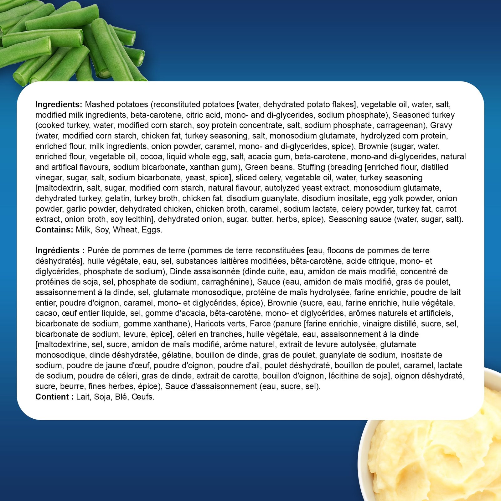 IngredientsMASHED POTATOES reconstituted potatoes (water. dehydrated potato flakes). soybean oil. water. salt. whey. beta-carotene. calcium caseinate. citric acid. mono- and di-glycerides. sodium phosphate. SEASONED TURKEY cooked turkey. water. modified cornstarch. soy protein concentrate. salt. carrageenan. sodium phosphate. GRAVY water. modified cornstarch. chicken fat. enriched flour. whole milk powder. chicken seasoning. monosodium glutamate. autolyzed yeast extract. salt. onion powder. potassium chloride. caramel colour. mono- and di-glycerides. spice. APPLE CRANBERRY DESSERT water. sugar. cranberries. rehydrated apples. modified cornstarch. dehydrated apple flakes. orange peel. seasoning. vanilla extract. citric acid. GREEN BEANS. STUFFING breading (enriched flour. distilled vinegar. sugar. salt. sodium bicarbonate. yeast. spice). sliced celery. rehydrated onion (water). soybean oil. turkey seasoning (maltodextrin. salt. sugar. modified cornstarch. natural flavour. autolyzed yeast extract. monosodium glutamate. dehydrated turkey. gelatin. turkey broth. chicken fat. disodium guanylate. disodium inosinate. dehydrated egg yolk. onion powder. garlic powder. dehydrated chicken. chicken broth. caramel colour. sodium lactate. celery powder. turkey fat. carrot extract. onion broth. soy lecithin). turkey fat. sugar. butter. dehydrated parsley. natural flavour. spice. SEASONING SAUCE water. soybean oil. sugar. salt. beta-carotene. mono- and di-glycerides. WATER