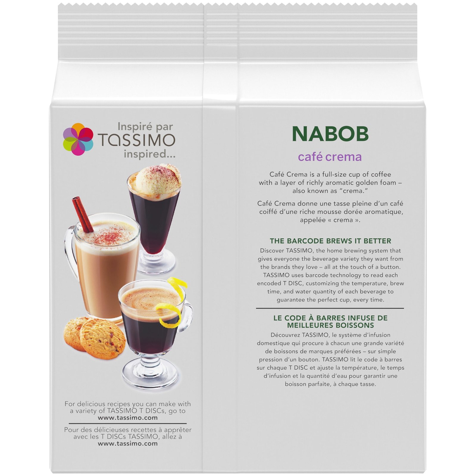 | Fabric Property | • One 110G bag of Tassimo Nabob Café Crema T-Discs (14 t-discs) • Each T-Disc makes one 8 fl oz/236 ml coffee • Bold roast coffee • Nabob Coffee is Rainforest Alliance Certified • T-Discs are compatible with Tassimo brewers |