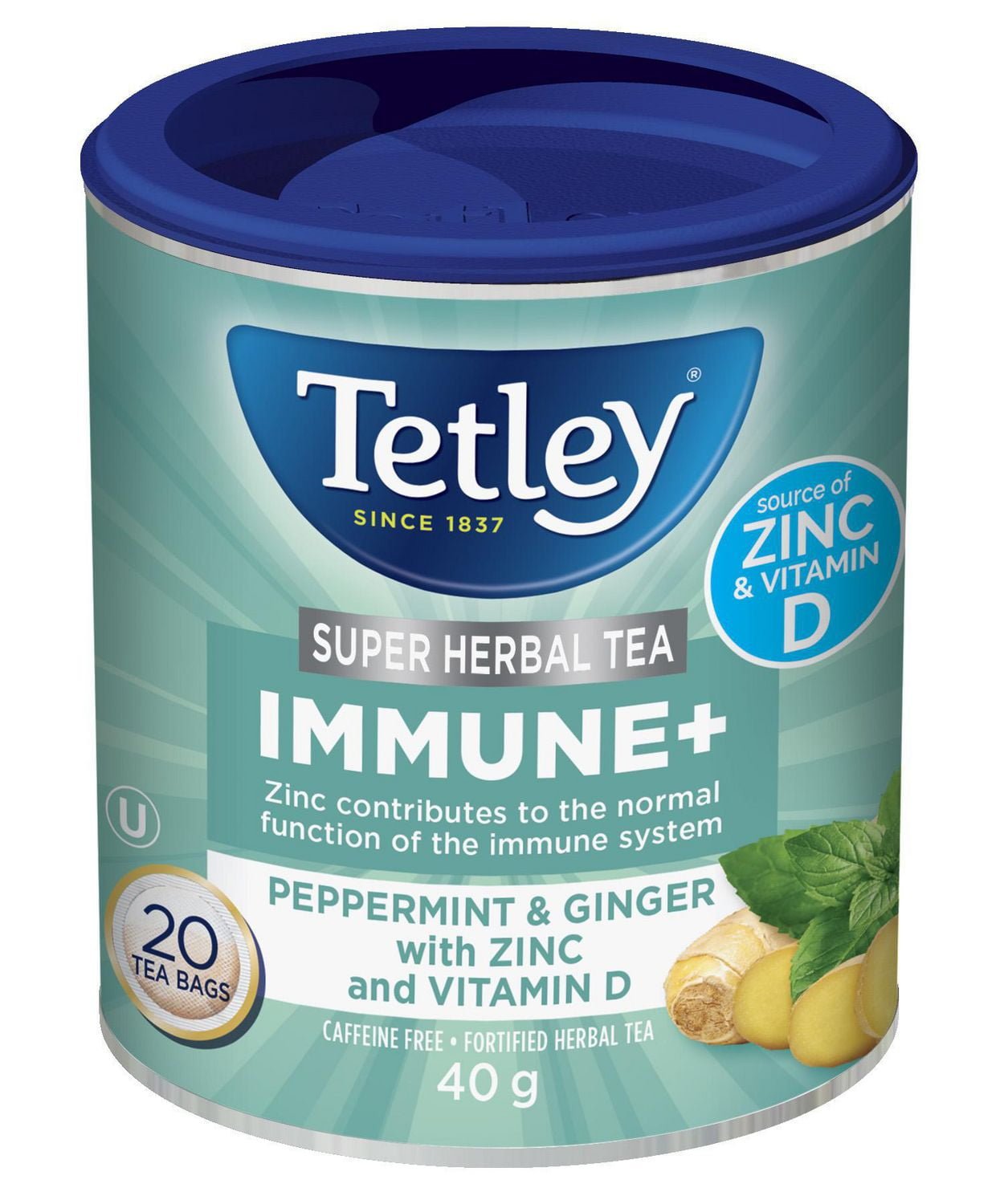 Tetley Super Tea Immune+ combines popular herbs. peppermint and ginger with added zinc and vitamin D