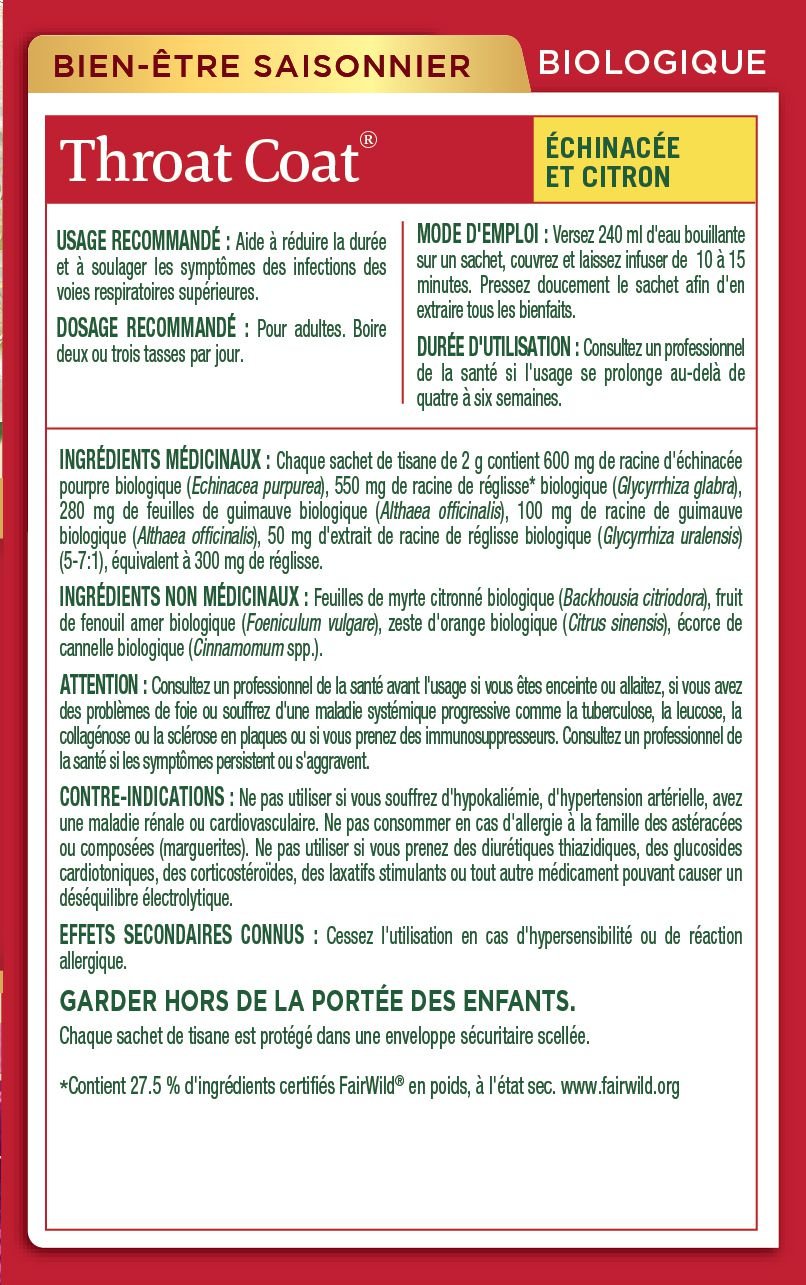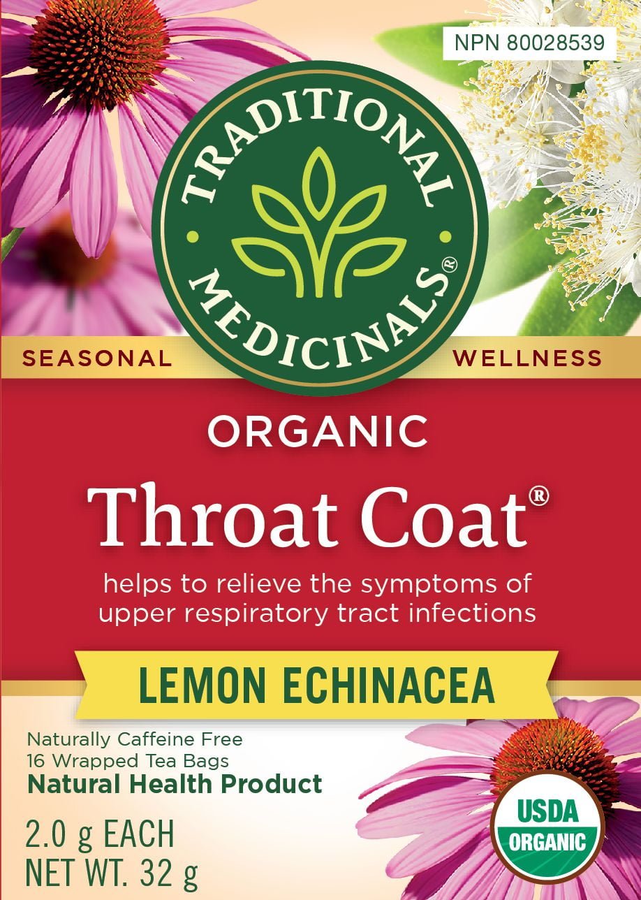 Traditional Medicinals Throat Coat Lemon Echinacea. 16 Wrapped Tea Bags