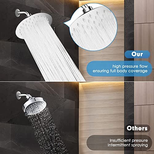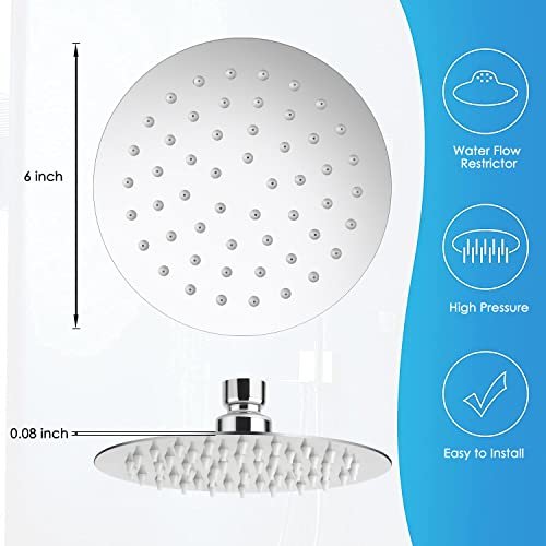 • 【POWERFUL WATER FLOW】A rainfall-like shower enjoyment is waiting for you! Our high pressure shower head will fulfill your needs. This high flow shower head is large enough (a diameter of 6 inches) and has an ultra thin thickness (0.08 inches). but not too thin to be damaged esaily. greatly enhancing the water pressure. 60 high-powered nozzles deliver powerful water flow. fully washing away the dirt and sleepiness after waking up and exercising.