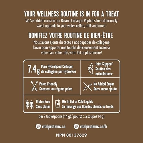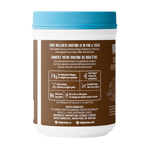 • Simple Ingredients: VITAL PROTEINS bovine collagen peptides chocolate powder is made with one simple medicinal ingredient. hydrolyzed bovine collagen peptides. and alkalized cocoa powder. stevia leaf extract. chocolate flavour. and salt (NPN 80137629)