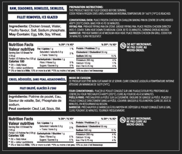 | Ingredients | Chicken BreastWaterFlavourSaltSodium Phosphate |