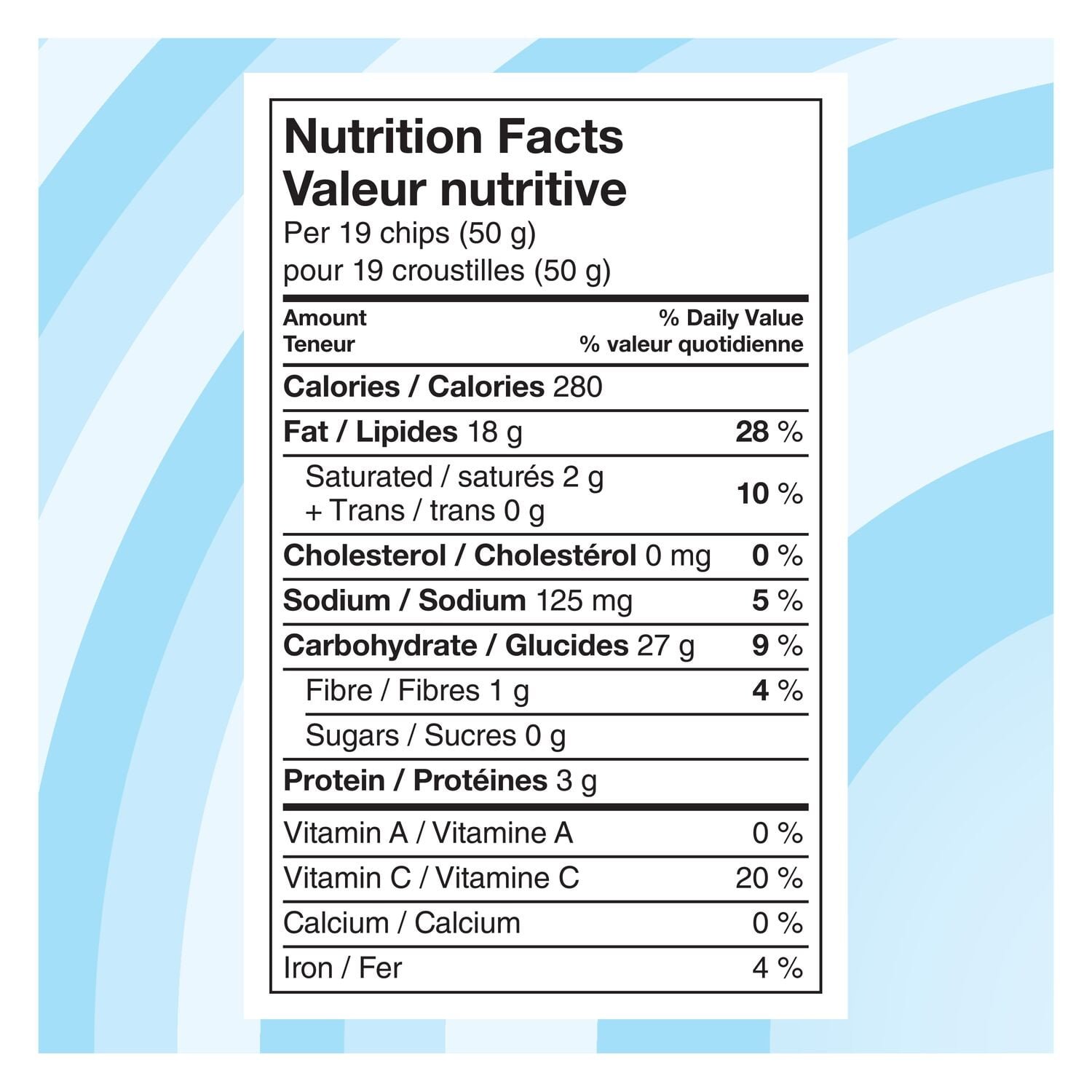| Fabric Property | A CANADIAN FAVOURITE — We’ve been a taste tradition in Canadian homes for many years. GUARANTEED FRESH — You can always count on Lay’s potato chips to pack delicious taste and crispy crunch. made with flavourful ingredients. DELICIOUS POTATOES – It all starts with quality potatoes. Simple. wholesome and real – so you get that perfect. crispy chip every time you reach for Lay’s. A SNACK TIME STAPLE – Snack time just isn’t complete without the timeless taste of Lay’s potato chips! LOTS OF VARIETY — Available in a delicious range of textures and varieties. Whichever flavour you choose. there’s something to satisfy your potato chip needs. |