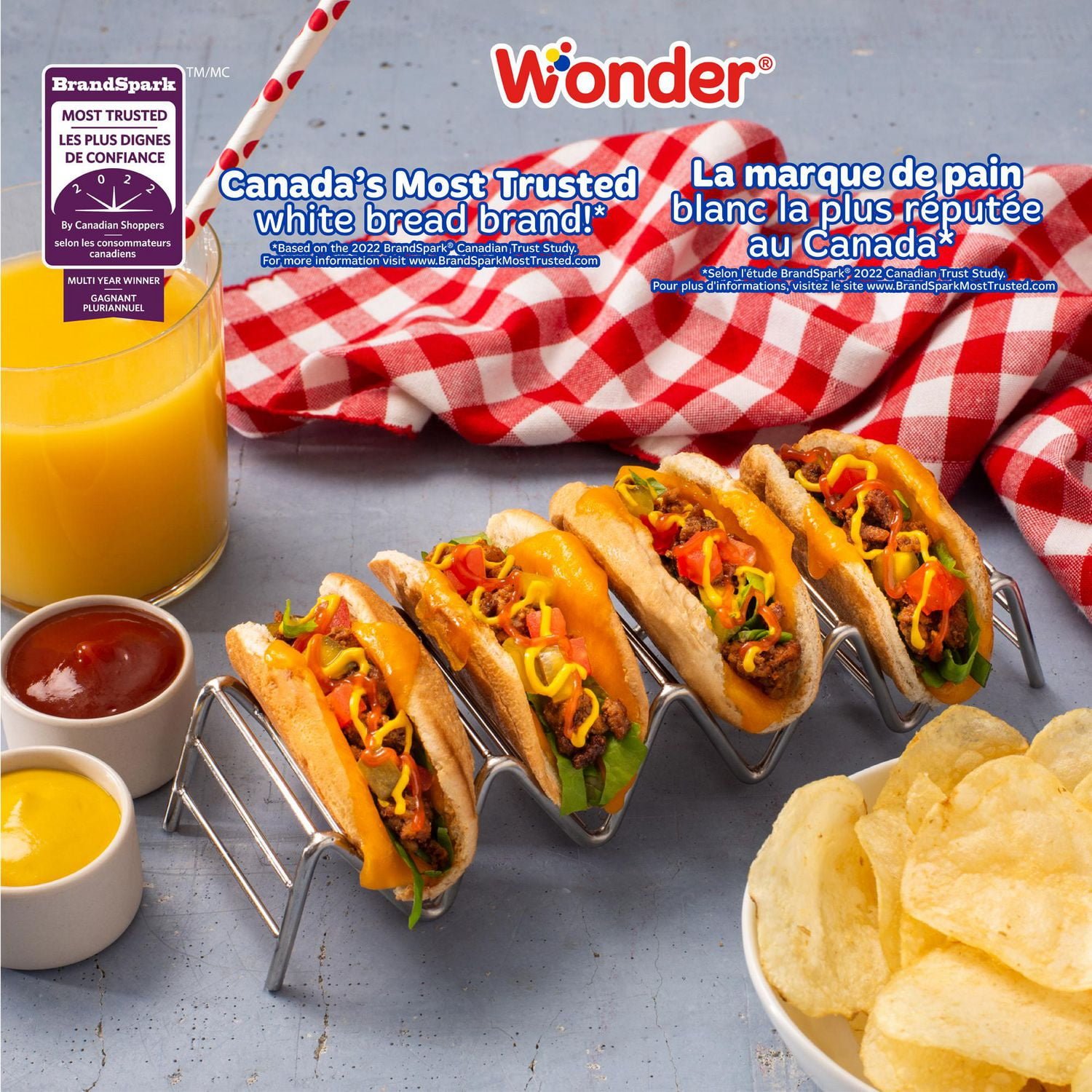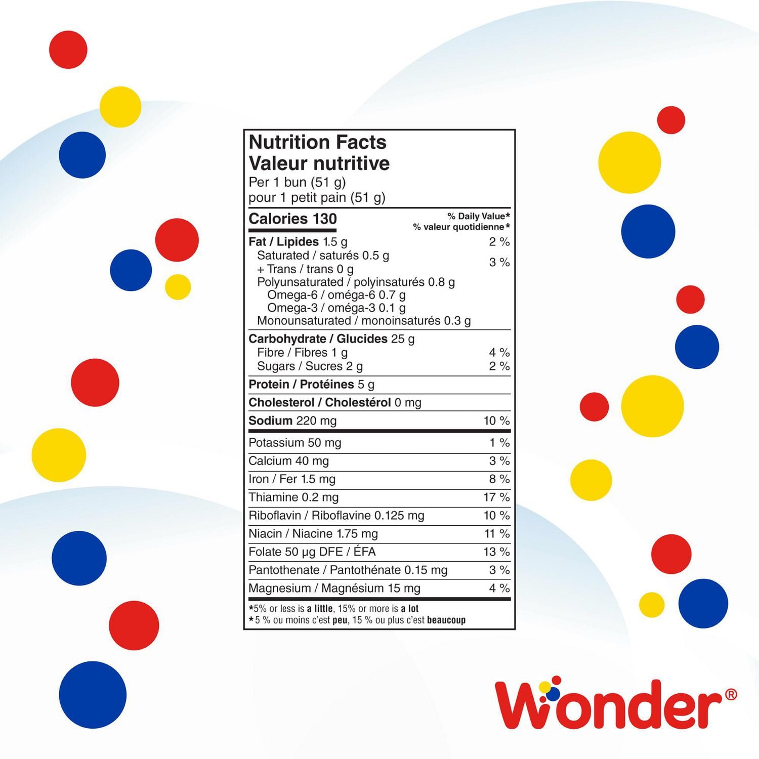Proudly baked in Canada. our delicious. soft. Wonder® White Hamburger Buns contain never contain artificial flavours or colours. With each bun containing essential nutrients you can feel good about serving Wonder® to your entire family.• Proudly baked in Canada