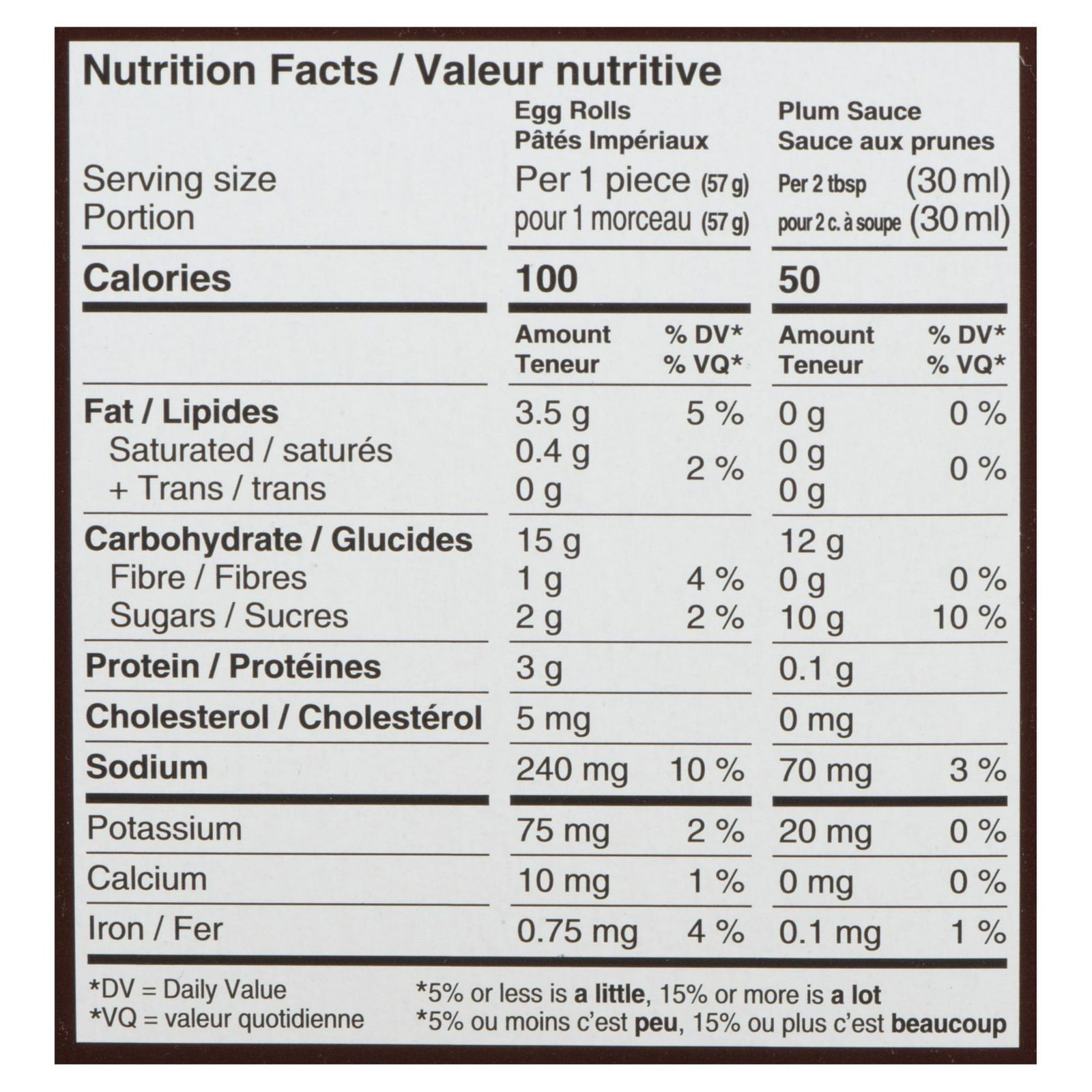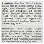 | Ingredients | Egg Rolls: Filling: Cabbage. cooked chicken. onions. carrots. celery. sugar. water chestnuts. modified cornstarch. salt. dehydrated red peppers. black pepper. spices. Wrapper: Enriched wheat flour. water. frozen whole eggs. salt. sodium propionate. mono and diglycerides. sodium stearoyl-2-lactylate. Cooked in canola oil. Contains: Wheat. Egg. Plum Sauce: Sugar/glucose-fructose. water. pumpkin. plum purée. white vinegar. modified cornstarch. salt. dehydrated garlic. artificial plum flavour. spice extractives. red chili pepper. concentrated lemon juice. colour. |