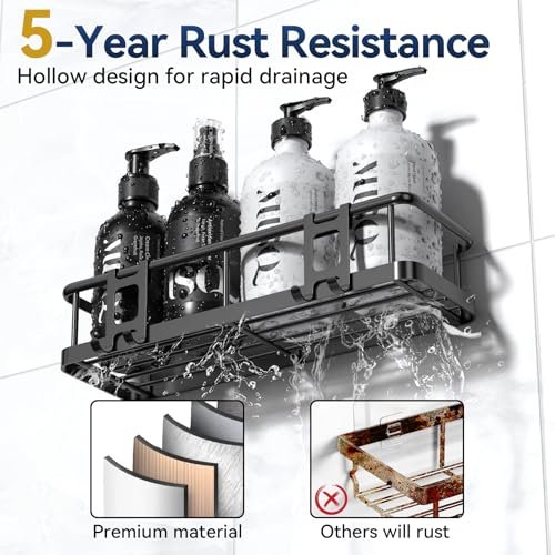 • 【Durable Metal. Hollow Drain Design】The bathroom shower racks are made of high quality metal. high temperature paint process. durable; Passed the 48-hour salt spray test. rust resistant. waterproof. scratch resistant. can accompany you for up to 5 years. Hollow design at the bottom. good ventilation and drainage. convenient cleaning. Keep shelves and bathroom necessities dry